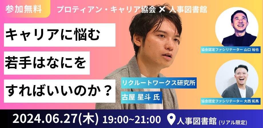 一般社団法人プロティアン・キャリア協会(東京都新宿区、代表理事:田中研之輔・有山徹、以下「当協会」)は、組織と個人のより良い関係構築と個人の主体的なキャリア開発をイベントや研修などのサービスを通じて支援する団体です。このたび、2024年6月27日(木)に人事図書館と当協会のコラボイベント「『ゆるい職場』著者・古屋星斗氏さんと考える、キャリアに悩む若手は、なにをすればいいのか?」を開催しました。本イベントは『「ゆるい職場」』著者の古屋星斗氏をお招きして、当協会の認定ファシリテーター大西拓馬、山口裕也とのリアル対談形式で開催されましたイベントです 。参加者のリアルイベントならではのキャリアへの不安、お悩みポイントに触れながら、キャリア形成のポイントを具体的なアクションを交えてお伝えしました。