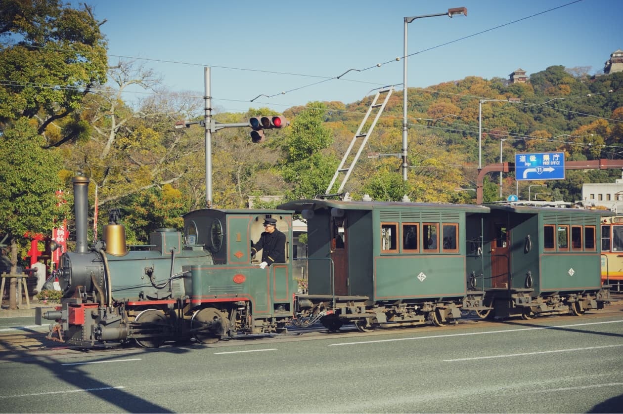 文豪、夏目漱石が自身の体験をもとに、松山の中学校を舞台に描いた小説「坊っちゃん」。その中に登場する蒸気機関車は1888年から67年間、実際に市内を走っており、小説の影響から「坊っちゃん列車」と呼ばれていた。現在市内を走っている列車は2001年にディーゼル機関車で復元したもので、レトロ感漂う車両が観光客に人気。乗務員の制服も昔の制服を復元している。