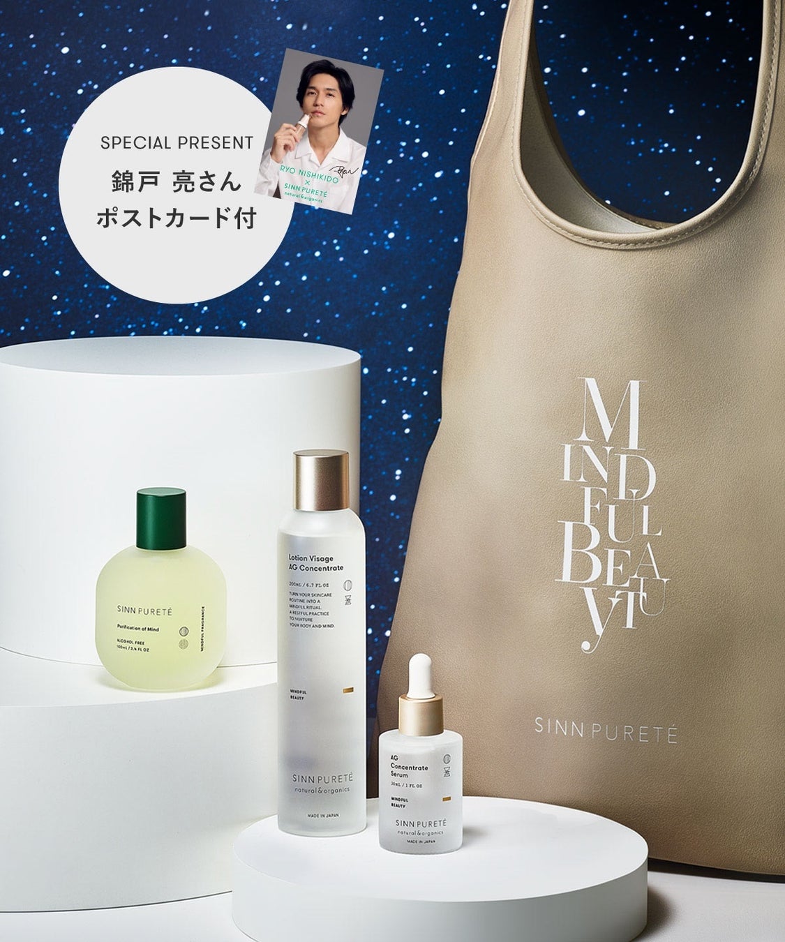 香りではじめるマインドフルビューティーの一連のステップを体感できるセット。フレグランスと大人気のヒトデ配合スキンケアをセットに。A4サイズ対応のヴィーガンレザートートバッグとここでしか手に入らない錦戸亮さん限定ポストカード付き!大切な方へのギフトや自分へのご褒美に。