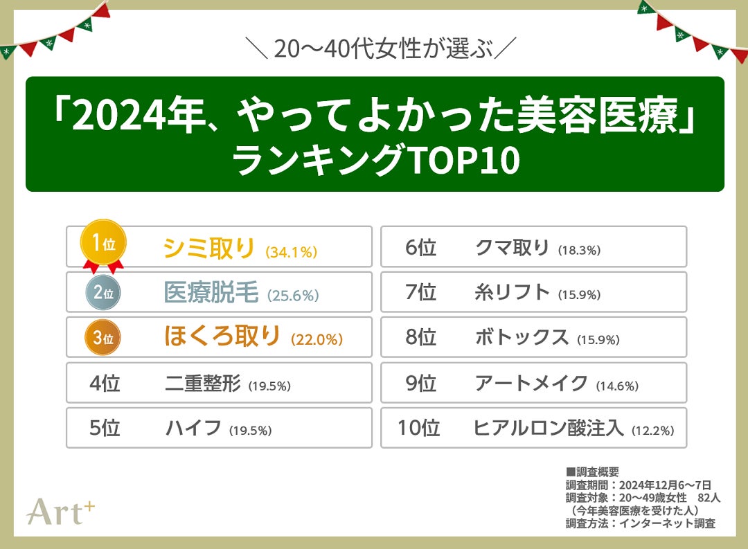 今回は20~40代女性を対象に、今年やってよかった・来年やりたい美容医療について調査しました。今後もArt+は、忙しい日々の中でもキレイを叶えられるような情報について発信をしてまいります。