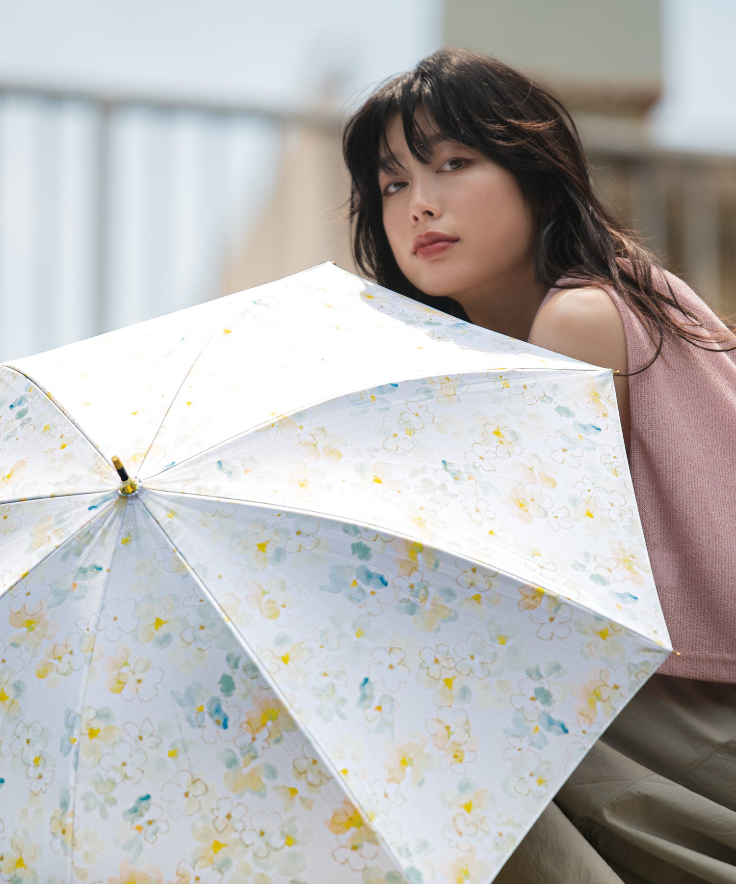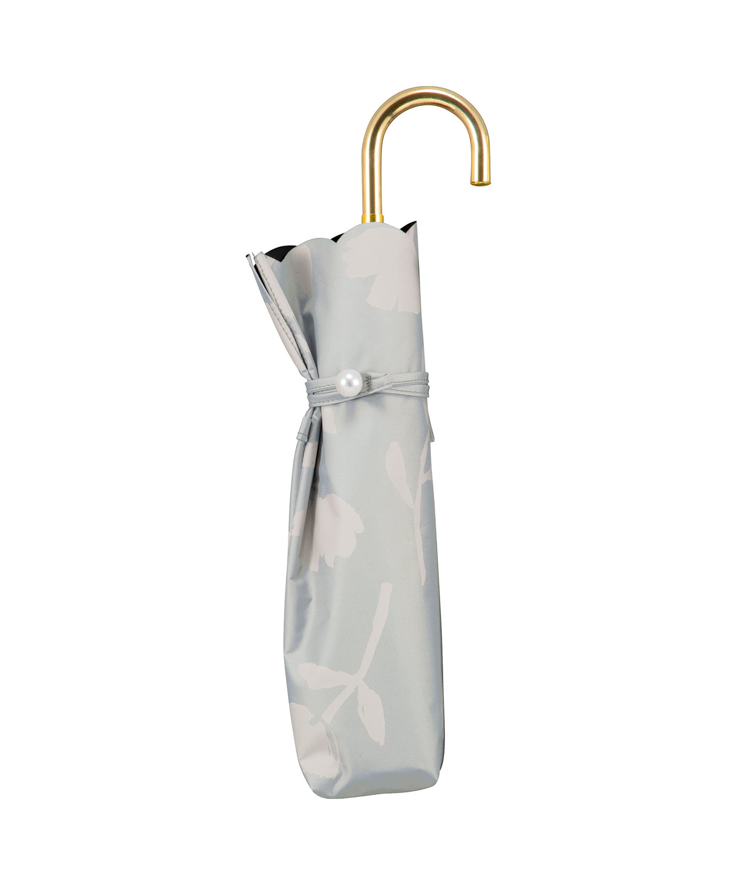 大きめサイズが嬉しい「遮光フラワーシャドウ」は様々なファッションに合わせやすい落ち着いた色味と、トーンオントーンで描かれた花柄が特徴。長傘と折りたたみ傘の収納袋の留め具にはパールのチャームが付いています。