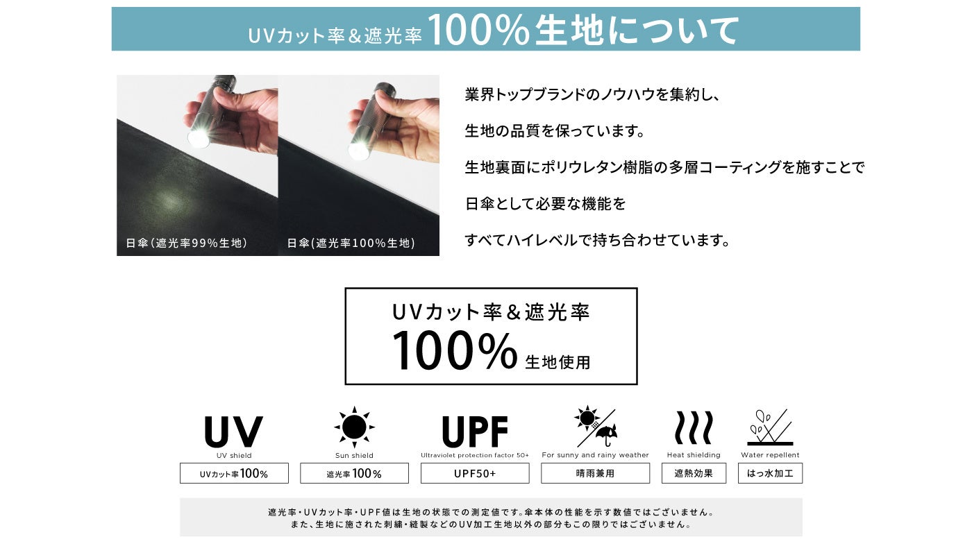 【機能性】UVカット率100%/遮光率100%/UPF50+/晴雨兼用/遮熱効果/はっ水加工