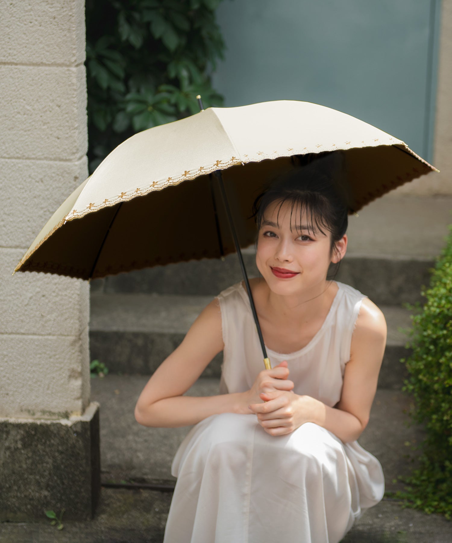 花柄の刺繍を施し、傘の縁に透け感のあるオーガンジーを合わせた「遮光リムオーガンジーフラワー刺繍」はカジュアル系にもフェミニン系にも合う万能なデザイン。