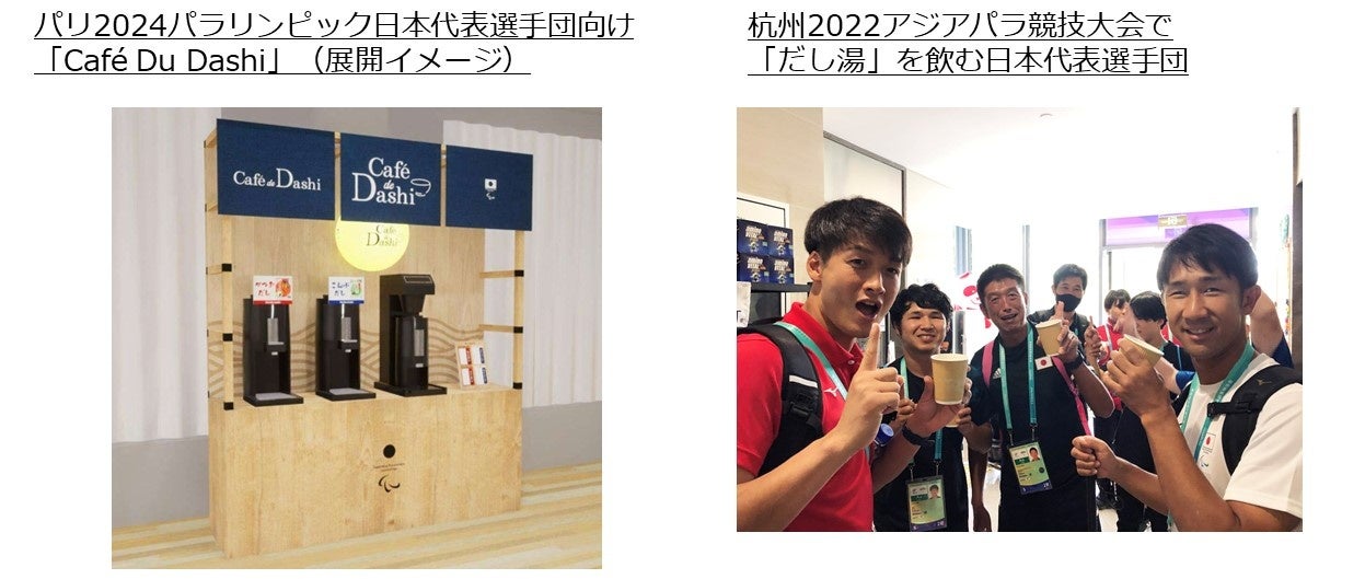 さらにパリ2024パラリンピックでは、JPCと共同で、日本代表選手団のための拠点「Café Du Dashi」(カフェ・ドゥ・ダシ)を開設します。2023年の杭州2022アジアパラ競技大会の際、現地で提供した「だし湯」について、選手団から“うま味があり、緊張した環境の中でほっとできた”、“食欲のスイッチになった”などの声が聞かれたことから、パリの「Café Du Dashi」では提供する「だし湯」の種類を増やし、選手たちのコンディション維持に貢献します。