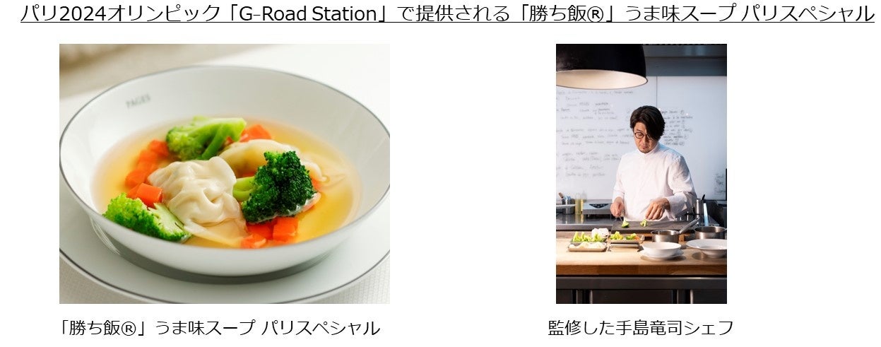またパリ2024オリンピックでは、JOCがリオ2016大会、平昌2018冬季大会、東京2020大会、北京2022冬季大会、杭州2022アジア大会に続いて開設する、競技直前の選手のための現地の栄養サポート拠点「G-Road Station」に協力します。「G-Road Station」では、主食の白飯・だし茶漬けや副菜、具だくさんの汁物などの和軽食を提供し、うま味のきいた、食べ続けやすい、食べなれたメニューによる戦略的栄養補給を可能にすると共に、リラックスできる空間を創出することで「TEAM JAPAN」のこころとからだを元気にします。和軽食については、今回、パリで活躍する日本人フレンチシェフ手島 竜司氏(※2)の監修によって「勝ち飯®」うま味スープ パリスペシャルを開発しました。経産鶏から抽出したフォン(だし汁)のイノシン酸と「味の素®」のグルタミン酸の相乗効果によって、非常に強いうま味を感じられるスープに、フランスでも製造している欧州味の素食品社のGYOZA(ギョーザ)と野菜が入った栄養バランスの良いメニューです。