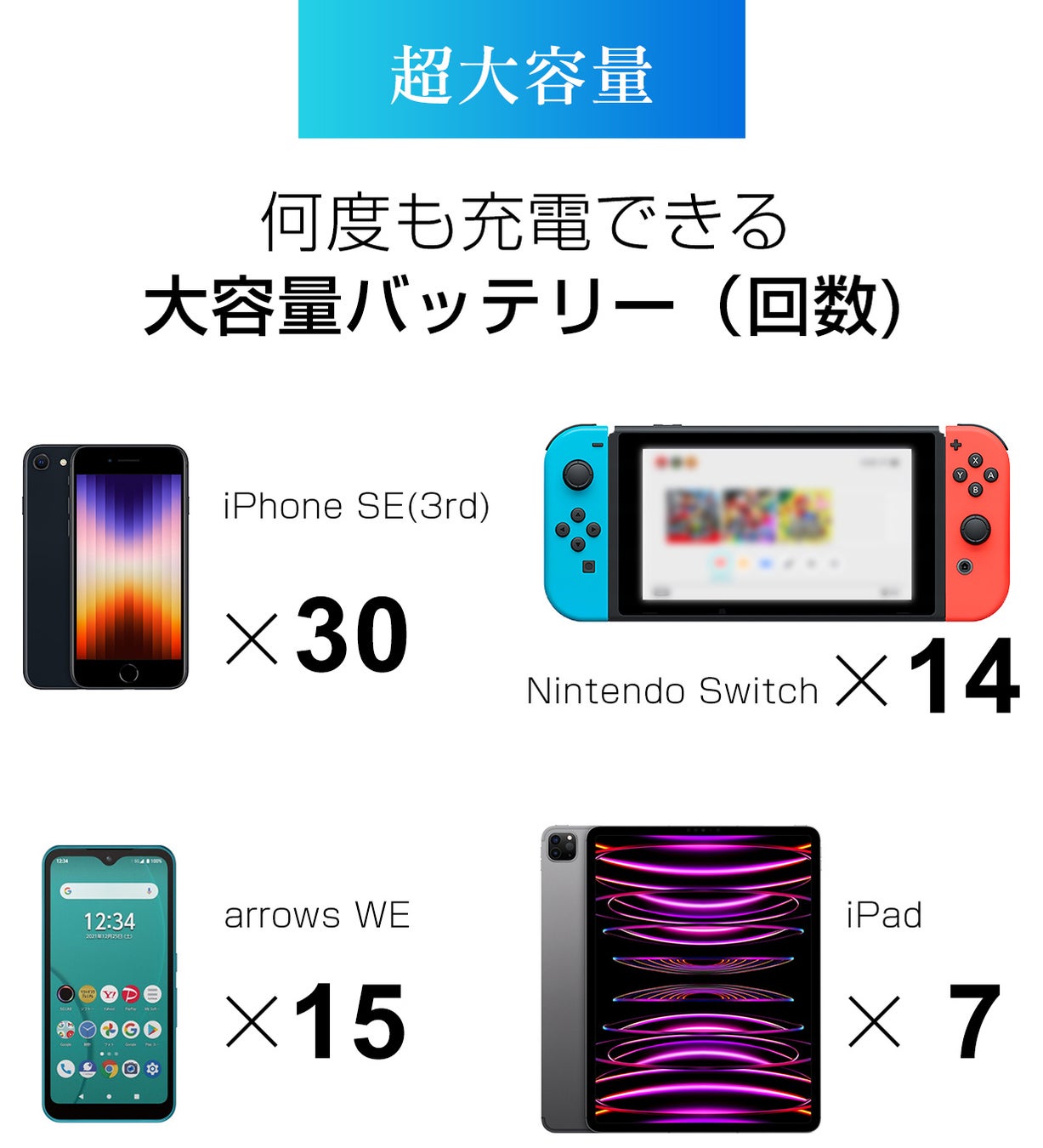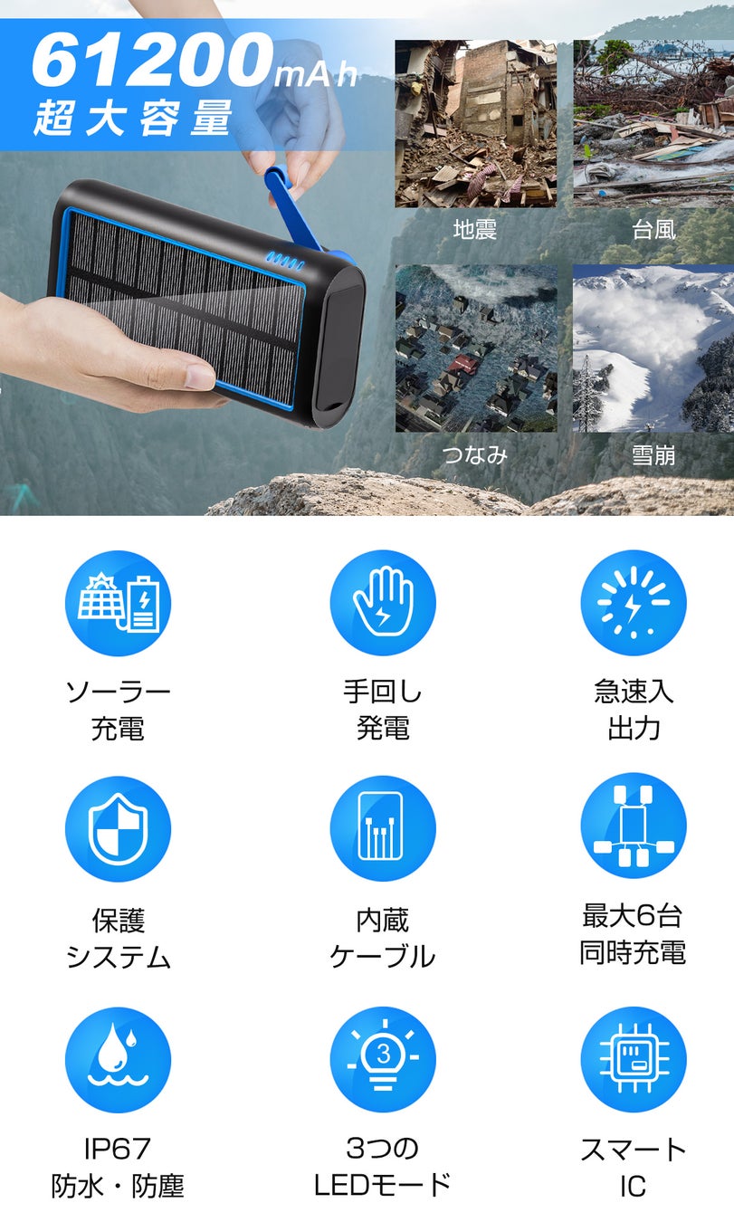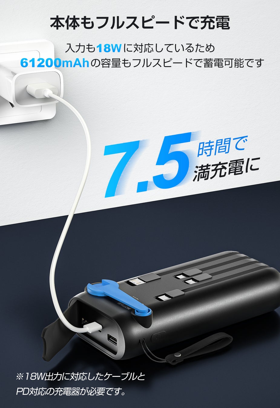 ◎61200mAh大容量モバイルバッテリー!複数出力&ケーブル付きで、最大6台まで充電可能。