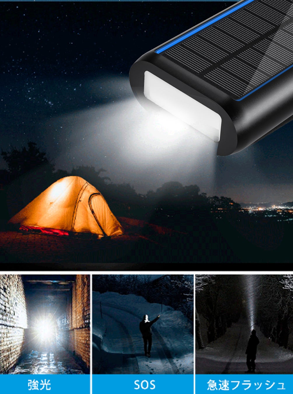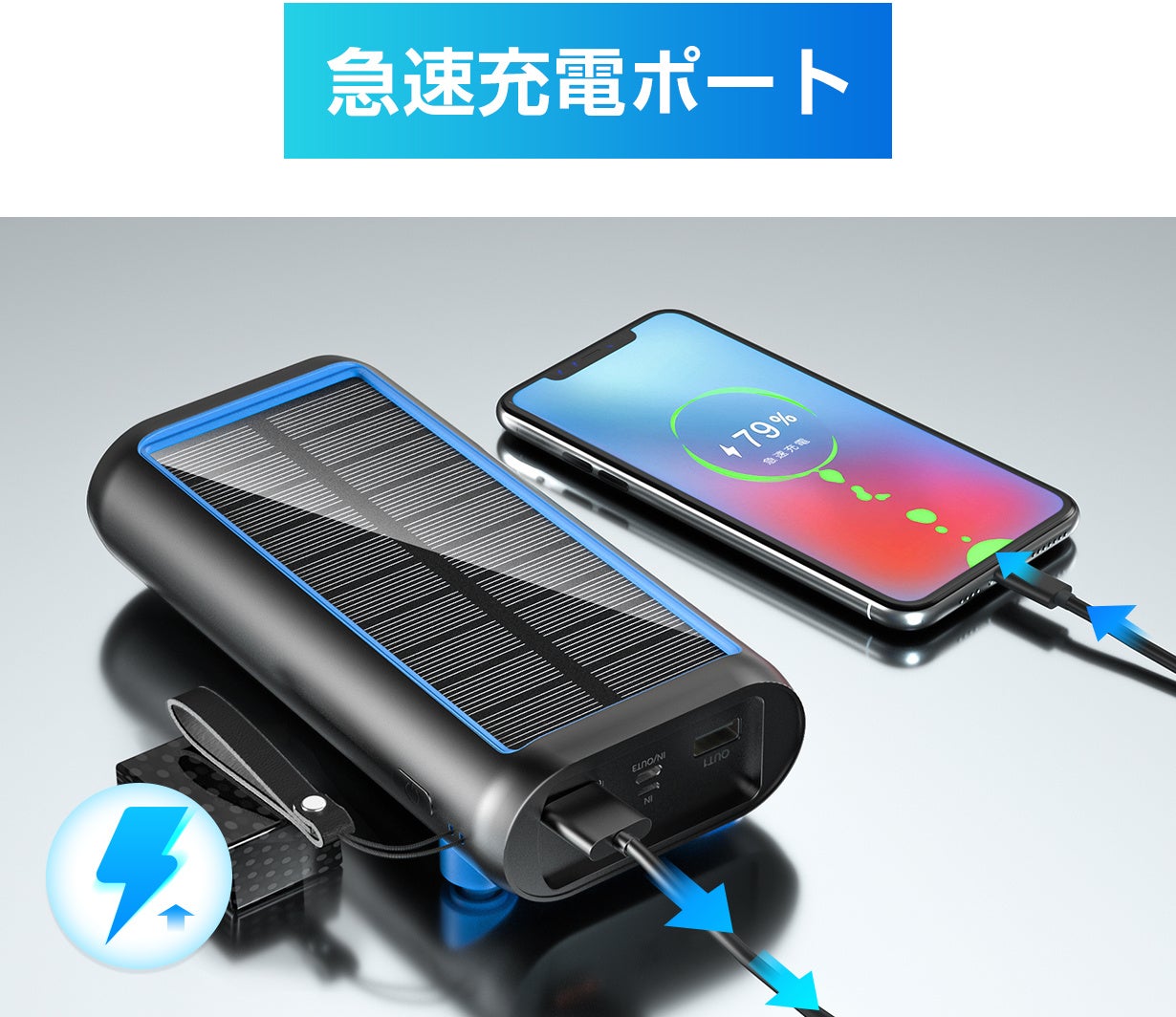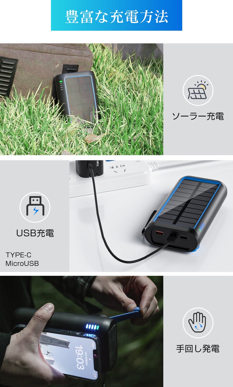ソーラー充電、懐中電灯、緊急発電のできる手回し充電等機能を一つにまとめたモバイルバッテリー。