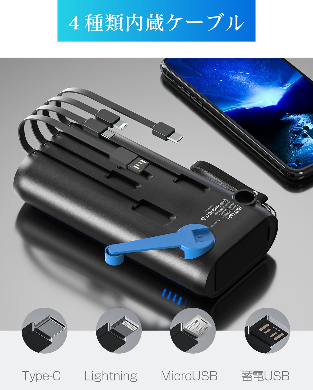 MOTTARI HP8-Aは4本内蔵ケーブル+2つのUSB-A出力ポート+1つのType-C出力ポートが搭載しています。