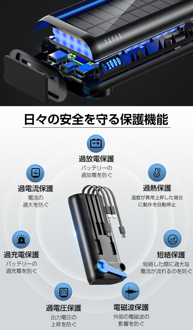 また、回路保護システムも装備されており、過充電、過放電保護や温度制御など、内部バッテリーが安全に動作するように監視および管理します。気軽にお使いいただけます。