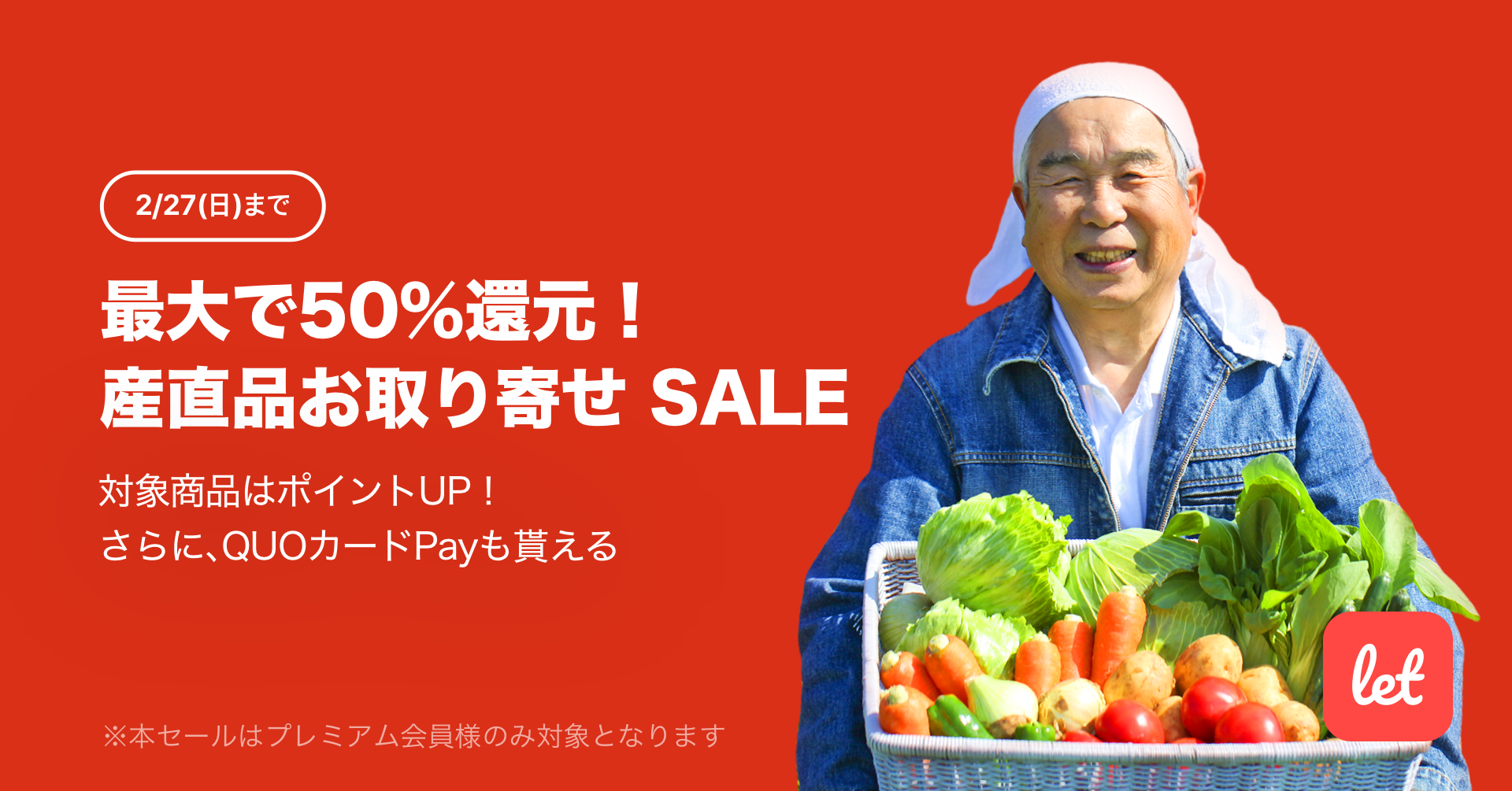 株式会社レット(本社:東京都港区、代表:佐藤 航陽)が運営する、食品ロス/在庫ロス削減のマーケット「Let(レット)」内で「最大で50%還元!産直品お取り寄せ SALE」を2月25日(金) 18:00より開催します。期間中、プレミアム会員様限定で対象商品を購入いただいた場合、QUOカードPayをもれなくプレゼント。最大実質半額で購入可能となります。