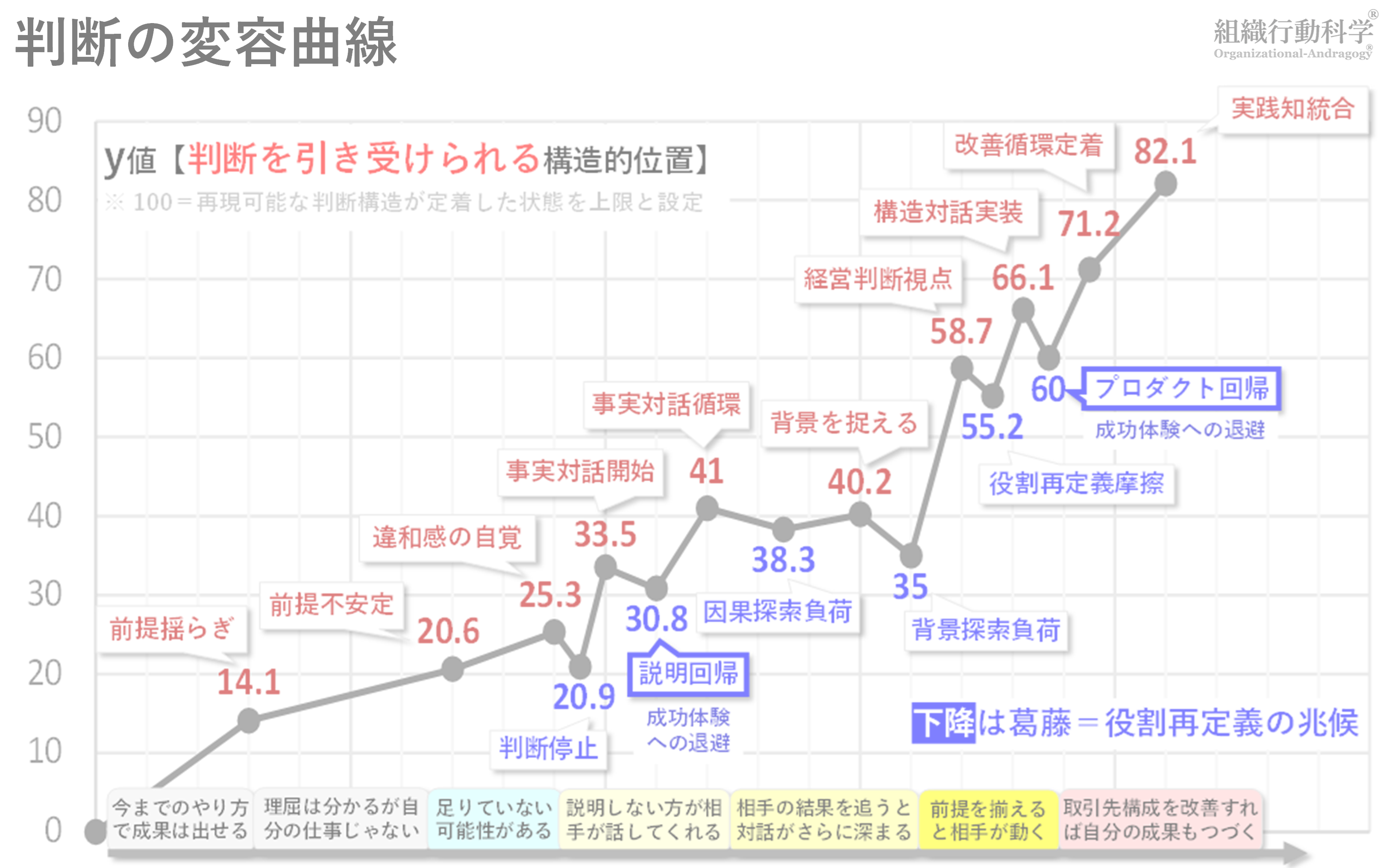 重要なのは、この変容が一直線には進まないことです。途中の下降や揺れ戻しは、単なる後退ではありません。むしろそれは、これまでの成功前例や役割認識では処理しきれない現実に直面し、判断の持ち方そのものが変わり始めている兆候です。