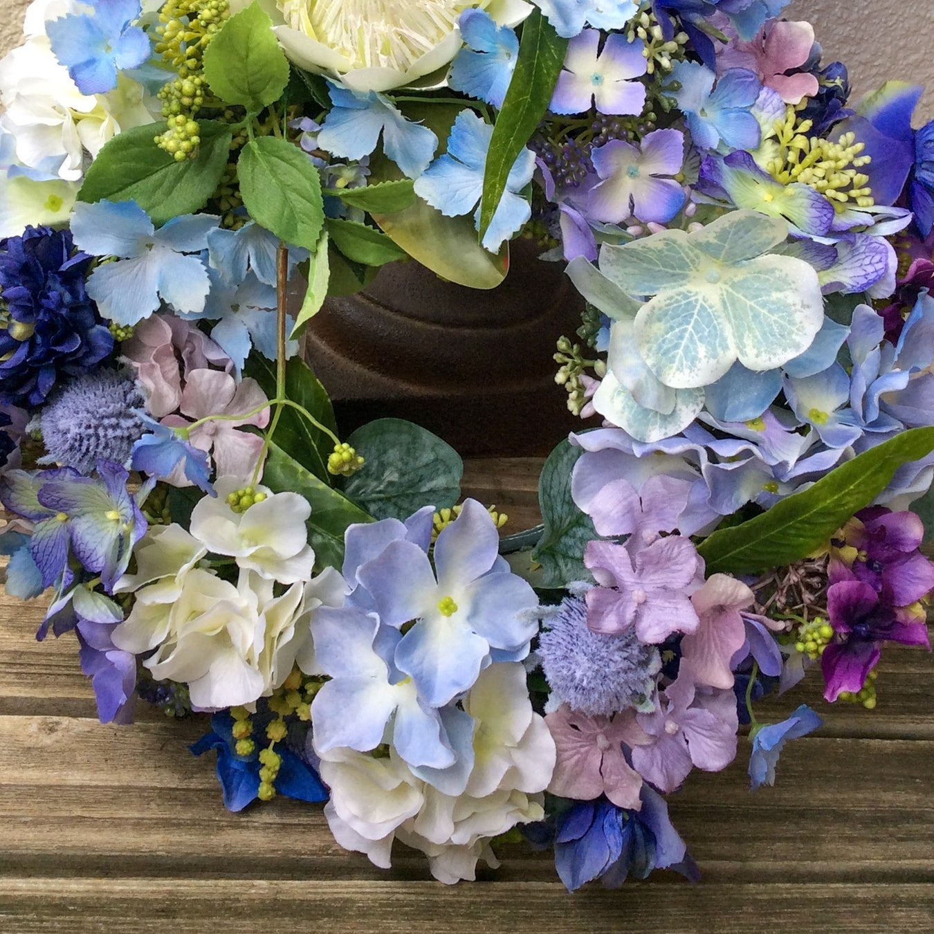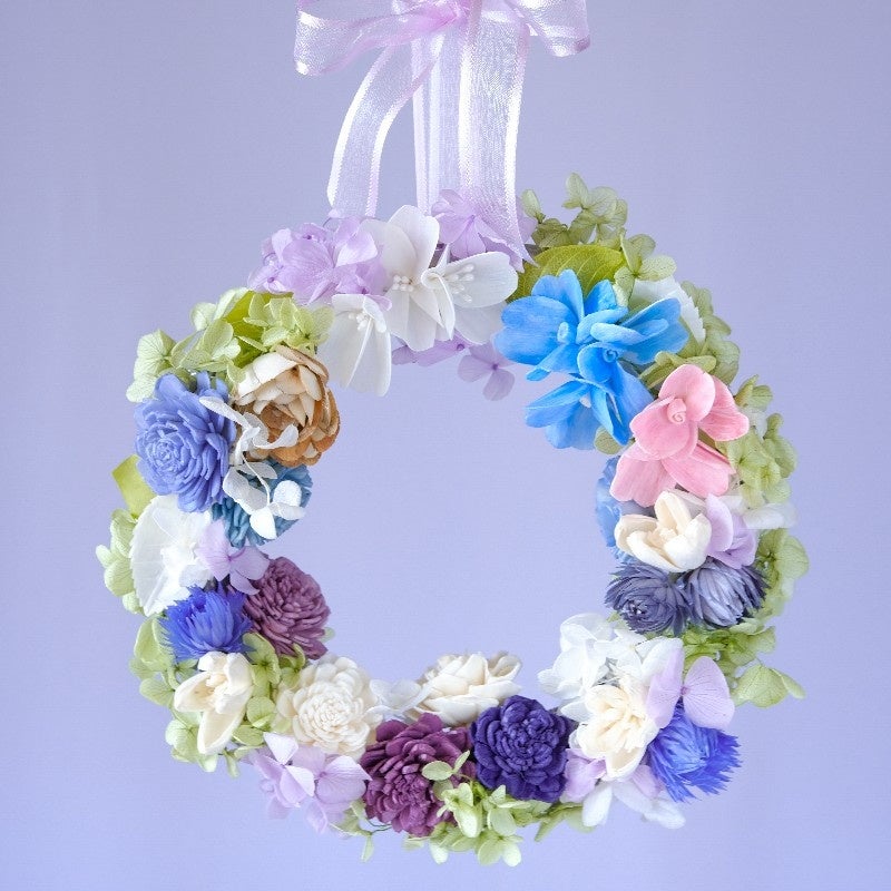 ソラはタイの水田に生えているマメ科の植物。ソラを乾燥させたシートをお花の形にしたものがソラフラワー。ソラを紫陽花に見立ててリースを作ります。