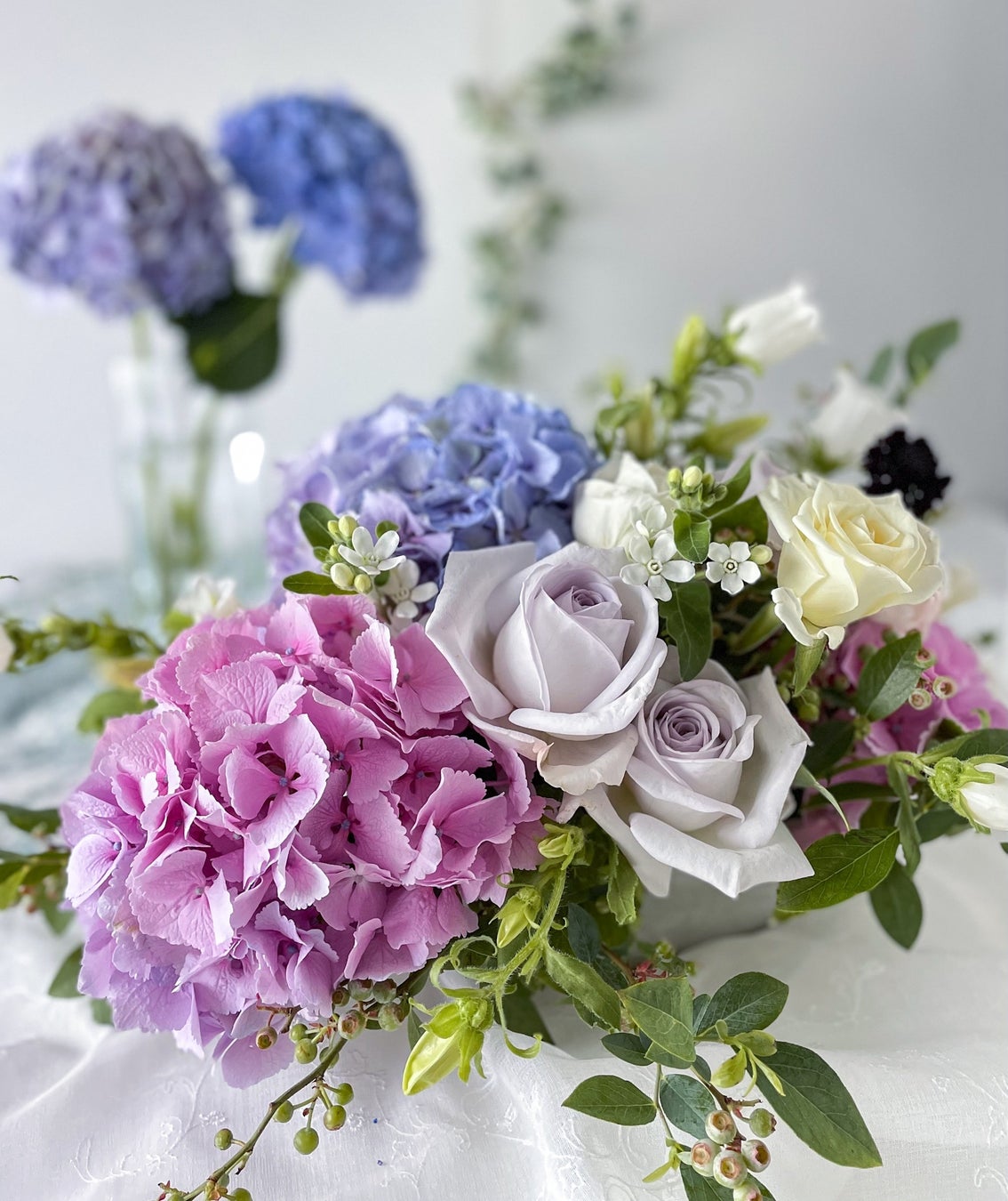6月の旬の花、紫陽花を使ってナチュラルなクラッチブーケを作ります。生花にアーティフィシャルフラワーの紫陽花を組み合わせることで、房でしか見せることができない紫陽花を、一輪一輪独立した花としてアレンジしていきます。