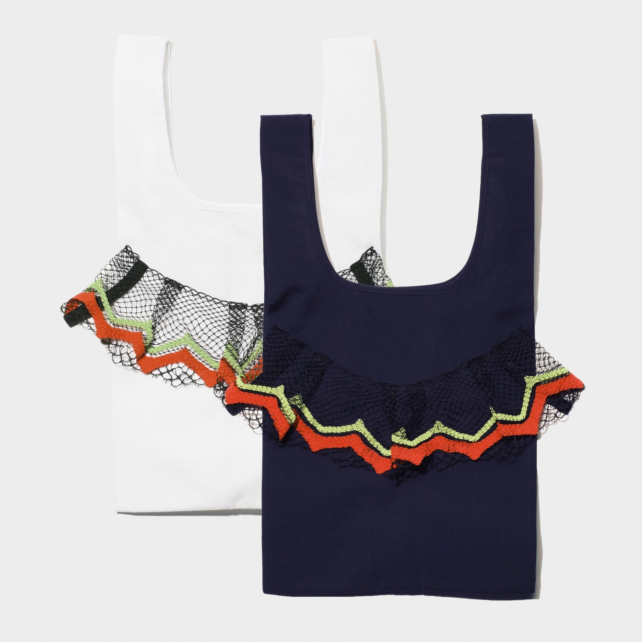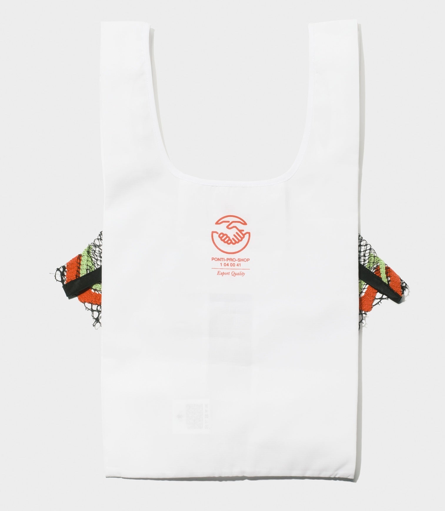 ブランド初期から使用しているワンダースレッドレースをポリエステル素材で制作。後ろ側のグラフィックは円(循環、地球)と握手(調和や持続可能性)をイメージ。地球や環境がより良いものとなるよう願いを込めて。