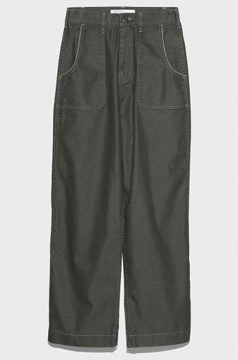 デニムの名産地、岡山県児島の〈ジョンブル〉とコラボレート。オーガニックコットンと再生ポリエステルの交織生地にユーズド加工を施した、大人の女性も履きやすい落ち着いたグリーンのベイカーパンツ。