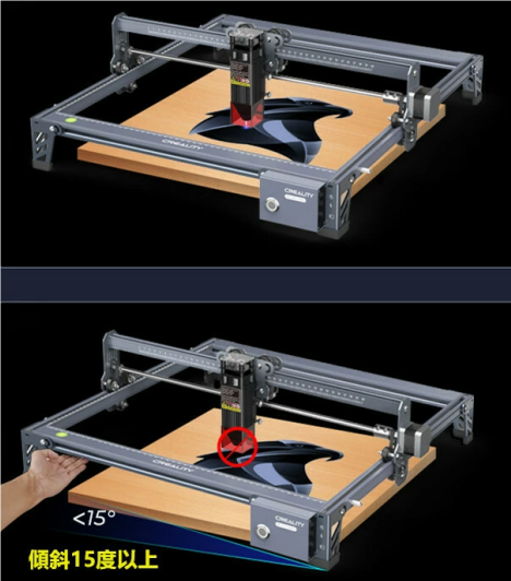 ▼15度以上の傾斜で不均一に置かれると、レーザーヘッドは自動的に放射を停止します。