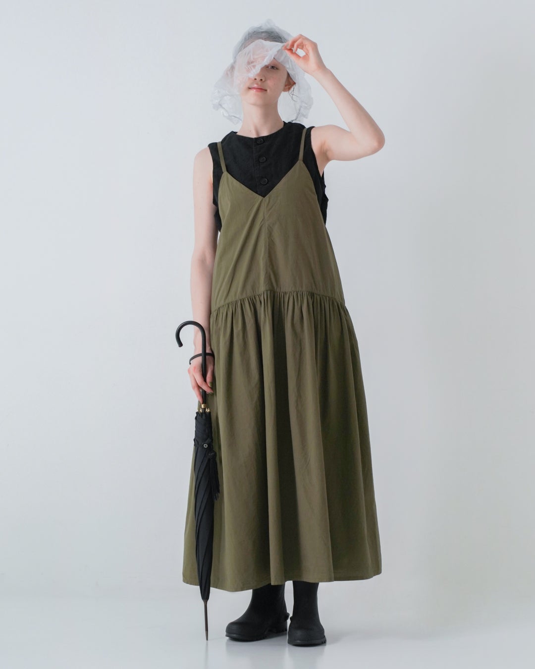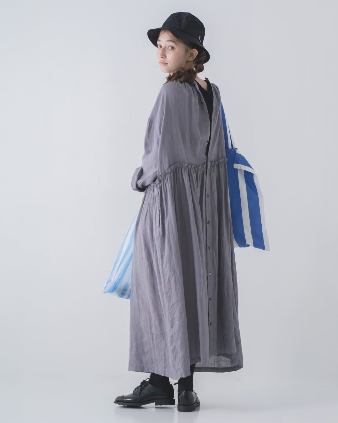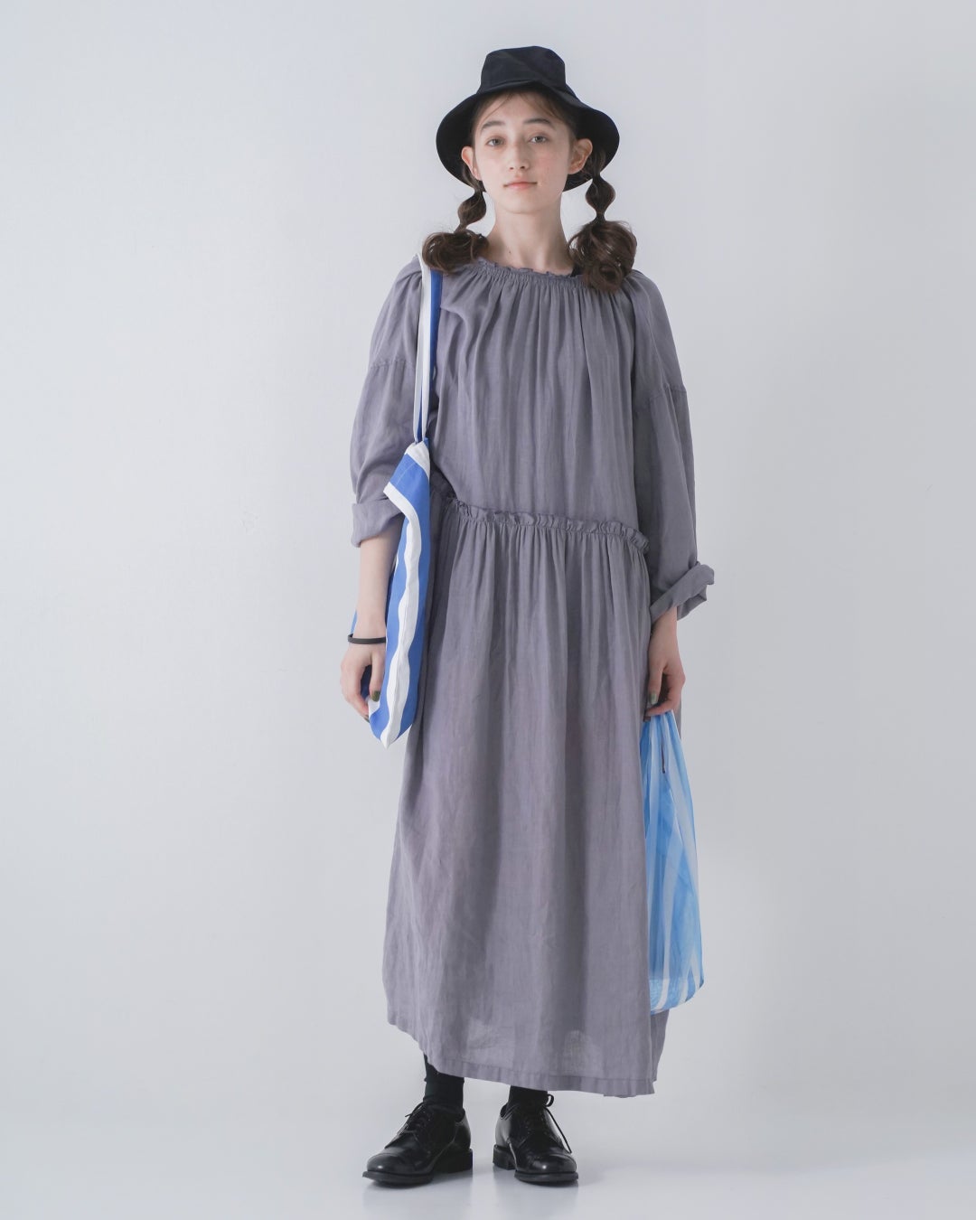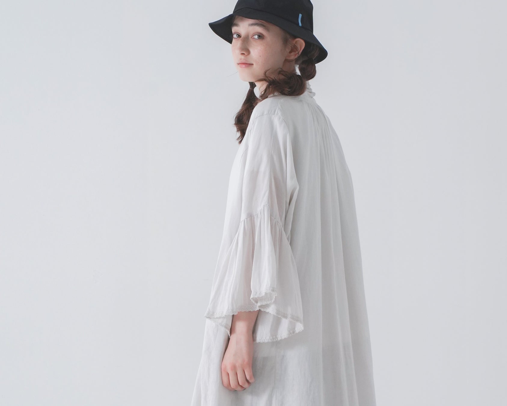 襟元に細やかなピンタックとギャザーをあしらったシャツワンピース。程良い透け感と、たっぷりとした身幅が、風通し良く涼やかな1枚です。