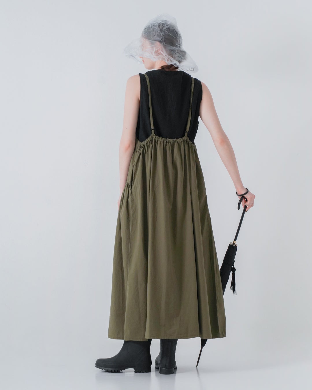 上品なツヤ感のコットンシルク素材に超撥水加工を施した機能性抜群。胸元のカッティングや、裾に向かって広がるフレアシルエットが女性らしい1枚です。