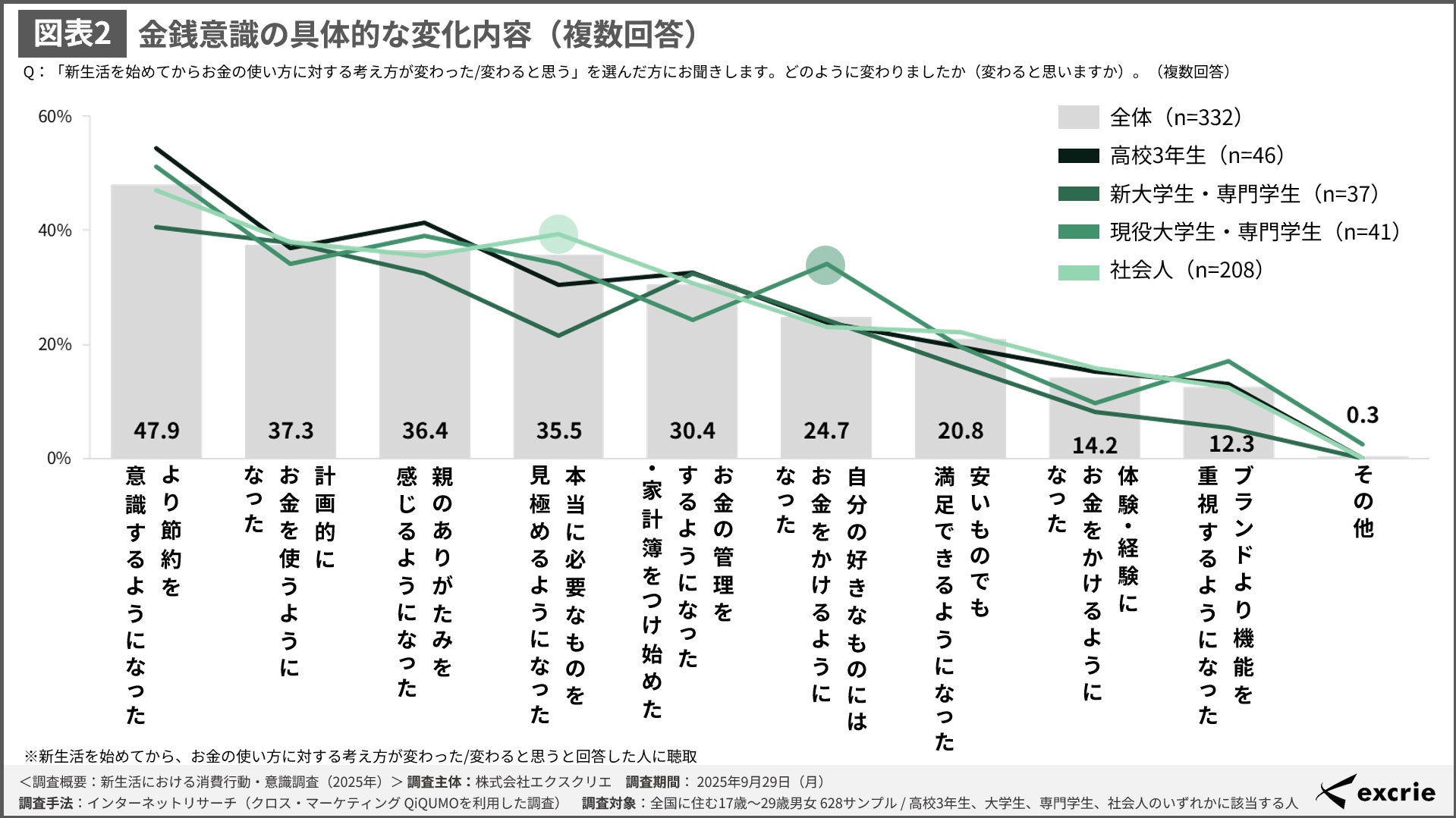 変化した金銭意識の内容として「より節約を意識するようになった」が最多となりました。また、現役大学生・専門学生は「自分の好きなものにはお金をかけるようになった」という回答が特徴的である一方、社会人は「本当に必要なものを見極めるようになった」という回答が多くなりました。(図表2)