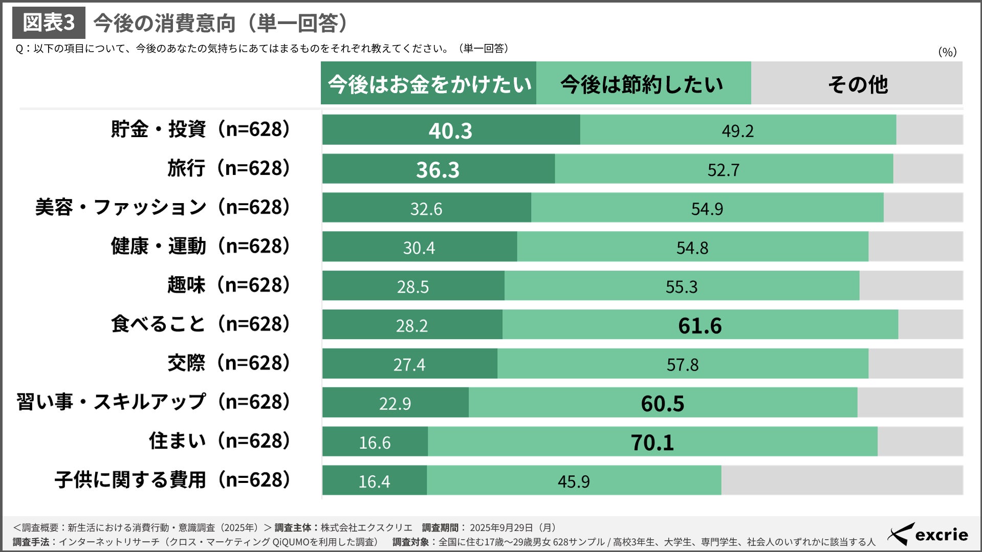 【新生活における消費行動・金銭意識に関する調査(2025年)】貯金・投資や旅行に「今後はお金をかけたい」、住まい・食事・スキルアップは節約志向―エクスクリエ調査