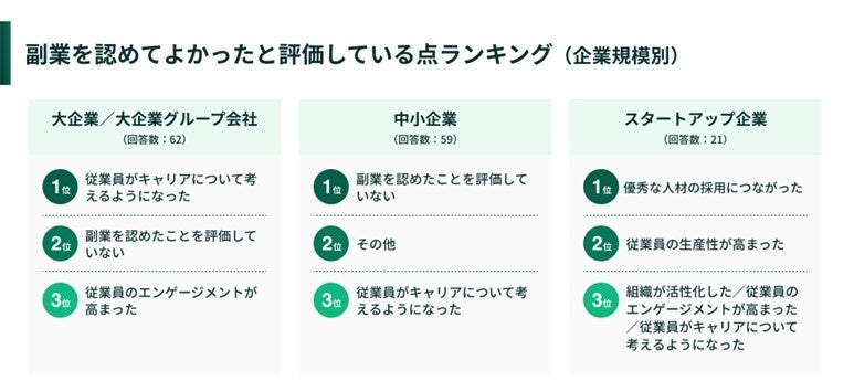 前編で「従業員が副業することをあなたの所属企業では認めていますか︖」 という質問に「認めている(一部認可を含む)」と回答した会社に対し、「あなたの所属企業で、従業員の副業を認めてよかったと評価している点は何ですか︖」と尋ねたところ、企業規模別に最も多かった回答は、大企業で「従業員がキャリアについて考えるようになった」が29%、中小企業では「副業を認め たことを評価していない」が32.2%、スタートアップでは「優秀な人材の採用につながった」が28.6%となりました。中小企業では、「従業員がキャリアについて考えるようになった」「従業員のエンゲージメントが高まった」等の回答も見受けられました。