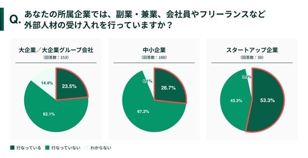 「あなたの所属企業では、副業・兼業、会社員やフリーランスなど外部人材の受け入れを行っていますか︖」と尋ねたところ、「行っていない」よりも「行っている」との回答が多かったのはスタートアップで、53.3%と突出して高くなりました。「行っていない」は、大企業で62.1%、中小企業で67.2%となり、外部人材を受け入れる会社は、まだまだ少ないという実情が伺えました。