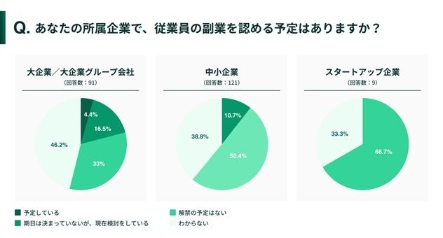 「あなたの所属企業で、従業員の副業を認める予定はありますか︖」と尋ねたところ、「わからない」を除き、「解禁の予定はない」 が、大企業・中小企業・スタートアップ、すべてにおいて最も多い回答となりました。しかし、大企業においては「期日は決まっていないが、現在検討をしている」が16.5%となったため、今後副業を認める大企業が少しずつ増えることが予測されます。