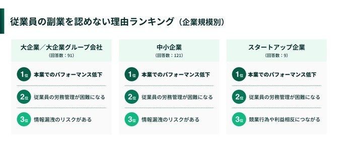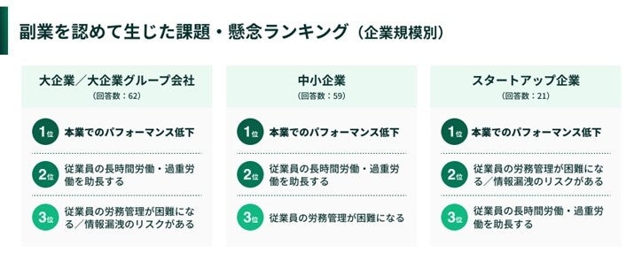 反対に、「あなたの所属企業で、従業員の副業を認めたことで生じている課題や懸念は何ですか︖」と尋ねたところ、「本業でのパフォーマンス低下」が、大企業(33.9%)・中小企業(37.3%)・スタートアップ(42.9%)すべてで最も多い回答となりました。