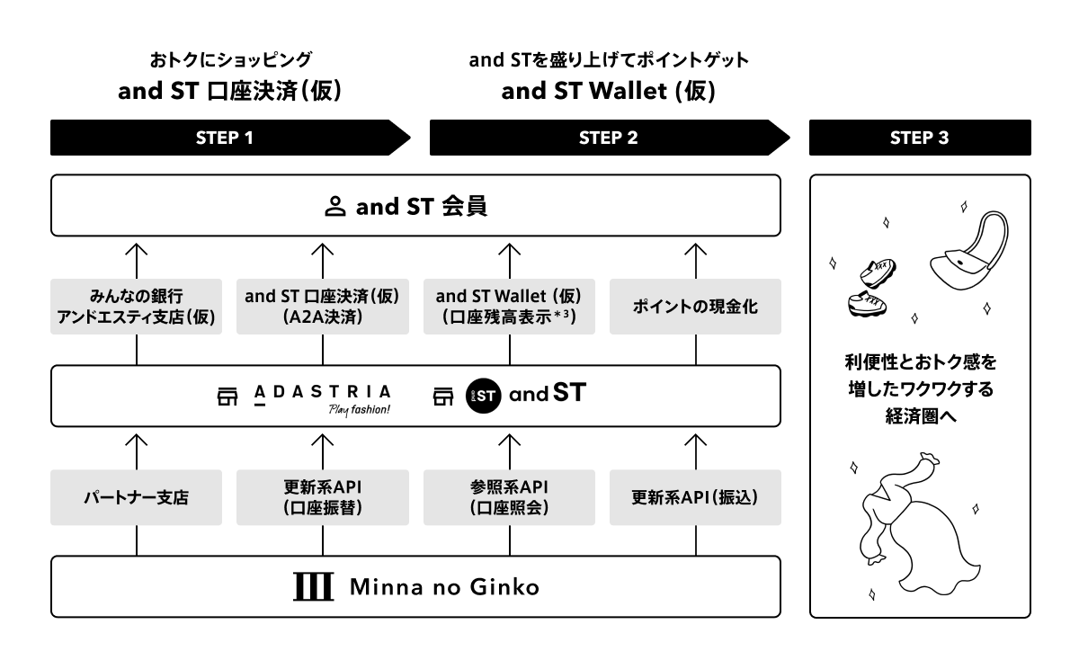 まず、STEP1として、おトクにショッピングができる「and ST 口座決済(仮)」の提供を予定しています。アダストリアのパートナー支店を開設し、みんなの銀行が提供する更新系API(口座振替API)と接続することで、andSTでの決済手段の1つとして銀行口座直結のA2A(*2)決済を実現し、独自の顧客還元による付加価値向上を検討していきます。