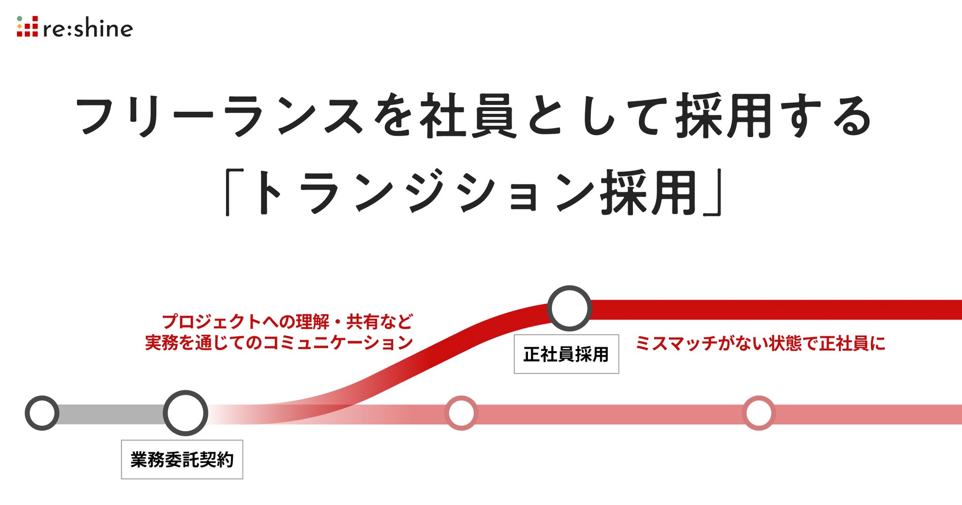 そこで「re:shine」では、企業・フリーランス双方にとっての新たな選択肢として、フリーランスを社員として採用する「トランジション採用」を提唱します。