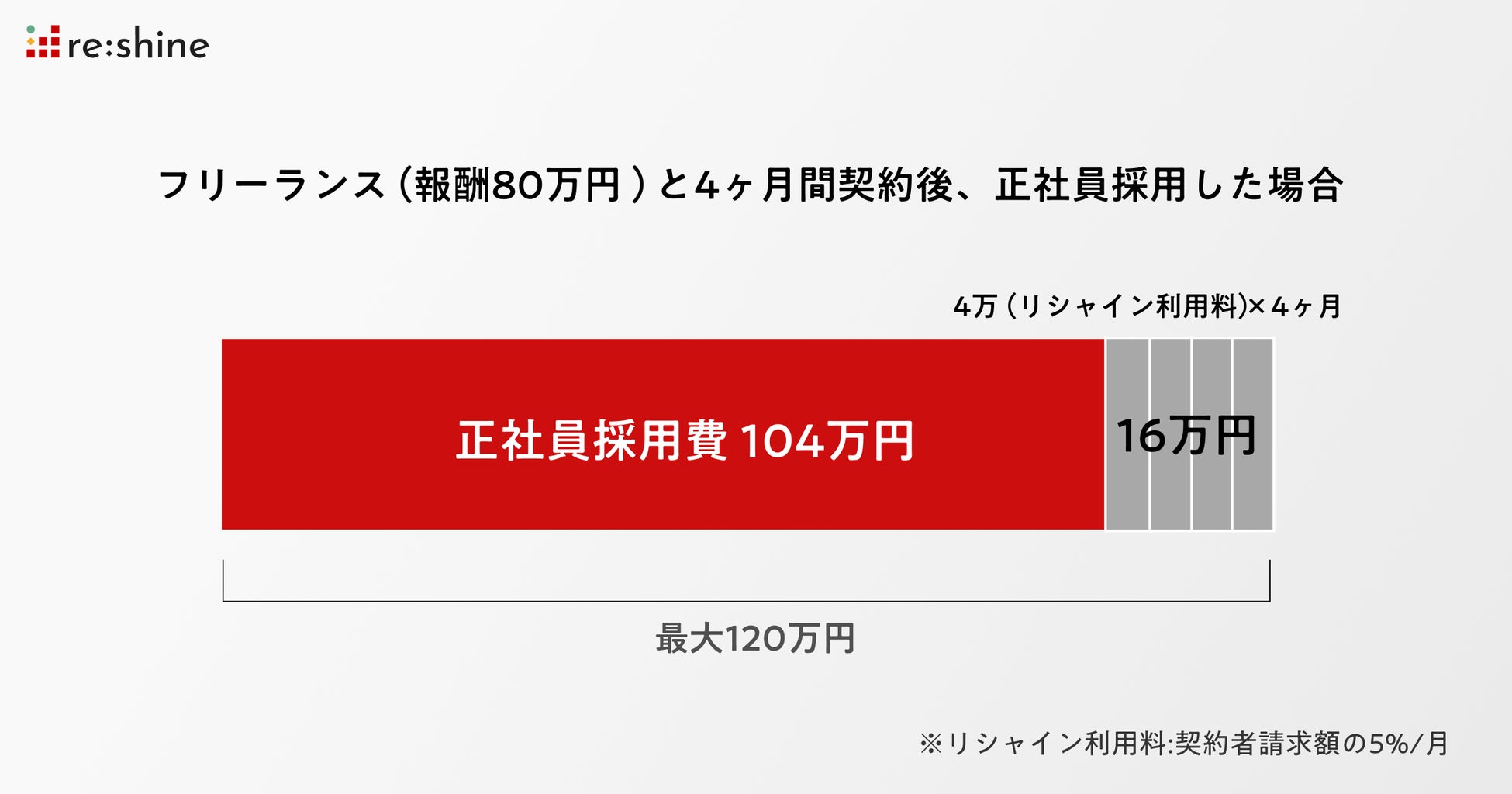 フリーランス業界において、フリーランスの正社員化は要望があった場合に都度対応するという形でこれまでも行われてきましたが、その際の料金は「違約金」や「紹介手数料」として200~300万円が相場でした。「re:shine」では、1名あたりの上限を120万円とし、さらに業務委託期間に発生した利用料(フリーランス請求額の5%/月)を差し引くことで、業界最安値を実現します。