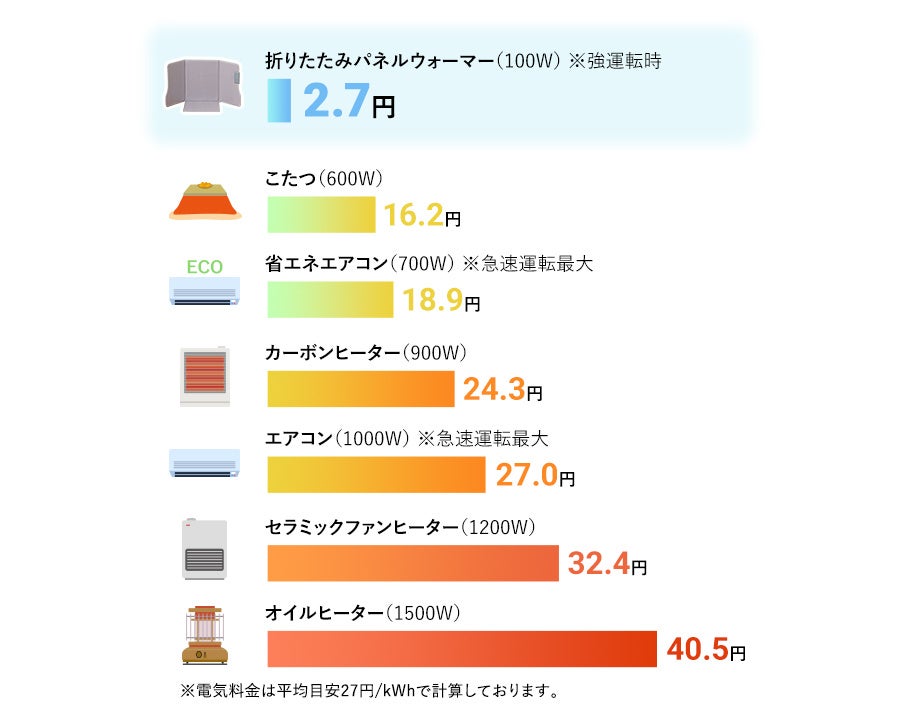 折りたたみパネルウォーマーは、他の暖房器具と比較しても大変省エネ・エコ設計のため、気兼ねなく使用できる点も魅力です。