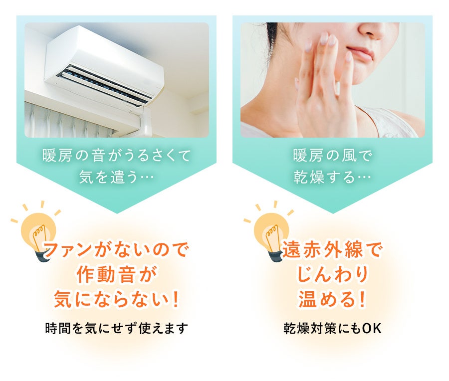 一般的な暖房器具は深夜や早朝に使用すると、意外に稼働音が気になったり、温風で湿度が下がり、肌の乾燥が気になる…というお悩みがありますが、ファンを使わず温風を排出しないパネルウォーマーなら、それらの悩みがなく快適にご使用いただけます。