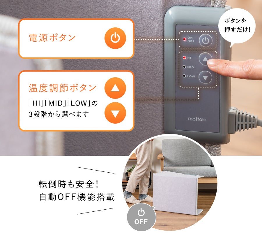 操作は簡単、ボタンを押すだけ! 温度調節は3段階から選べます。