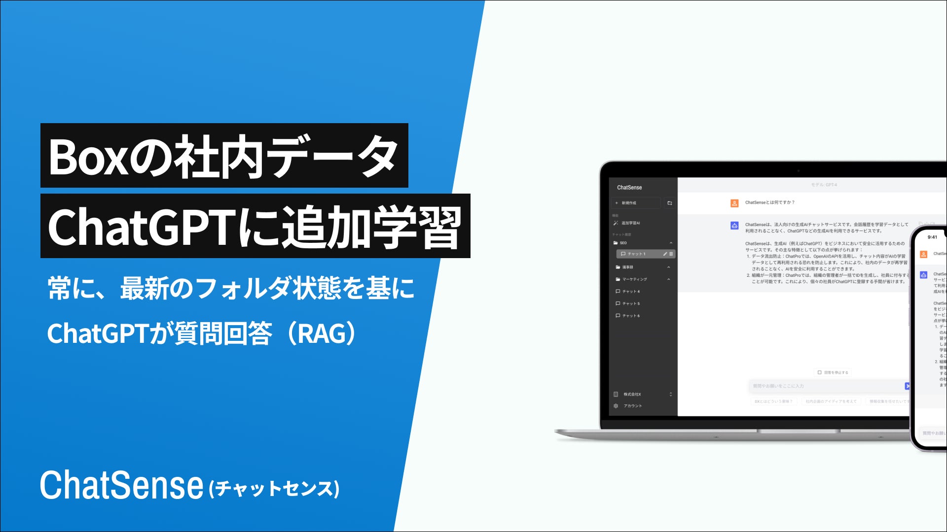 株式会社ナレッジセンスは、社内データを生成AI追加学習(RAG)できる、法人向けChatGPTサービス「ChatSense(チャットセンス)」を提供しております。この度、コンテンツクラウドBox連携のフォルダの内容を学習できるように対応予定であるをお知らせいたします。このBox連携機能を利用することで、クラウドストレージ「Box」で指定したフォルダ内にあるワード・エクセル・PDFファイル等の社内データを、ChatSense上の「専門家AI」の学習ソースとして連携することが可能です。また、この機能では、Box上でファイルの更新があった際も、ChatSense上の生成AIが「自動的に」更新されるという、便利な機能となっております。追加学習(RAG)機能についてはこちらをご覧ください。