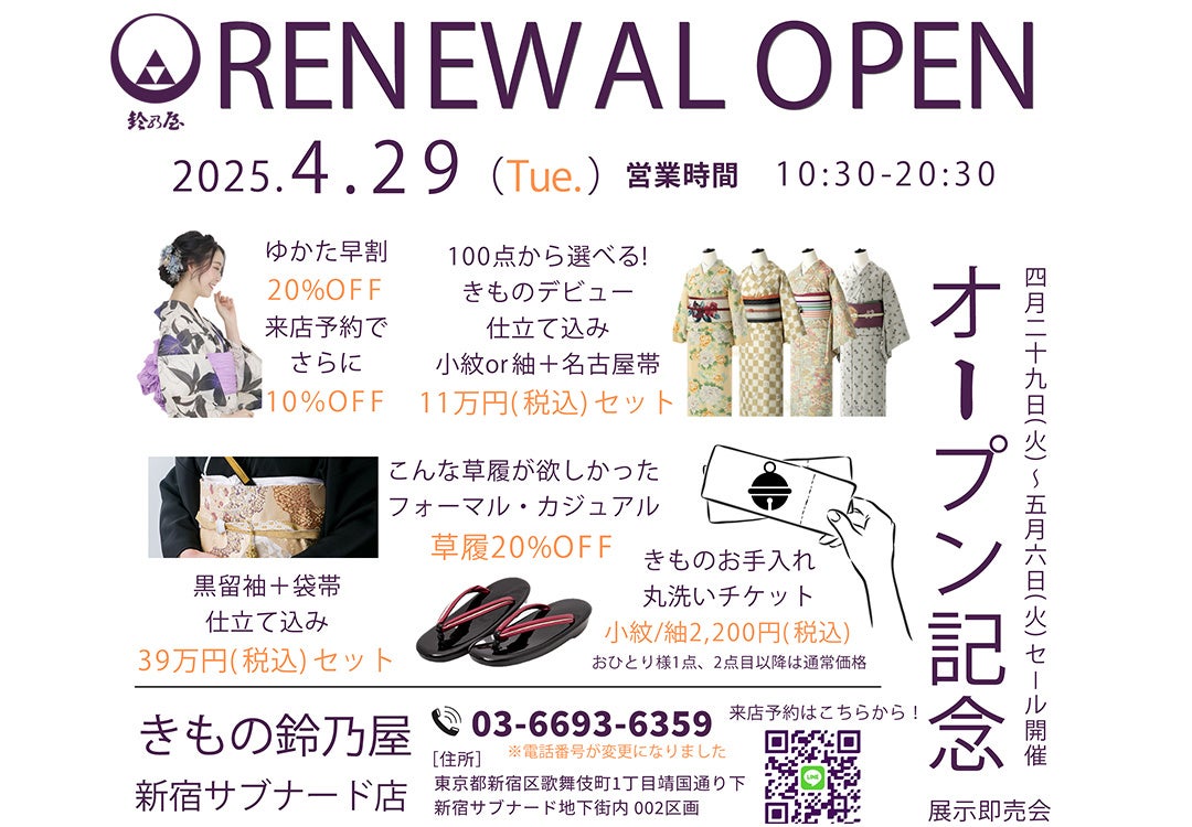 きもの鈴乃屋新宿サブナード店が4月29日(火)にリニューアルオープン!5月6日(火)まで展示即売会を開催し、お得な商品を多数ご用意してお待ちしております。