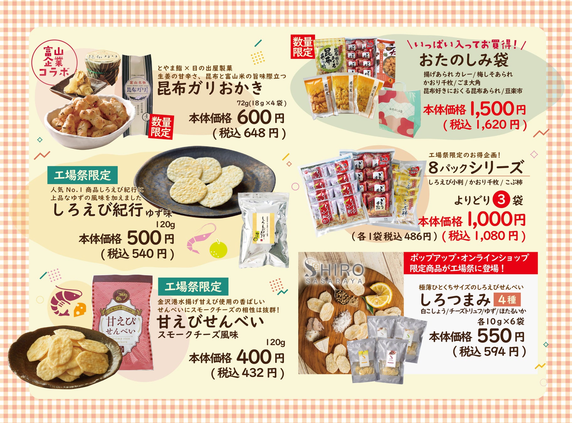 普段はささら屋店舗で販売を行っていないSHIRO SASARAYAブランドの人気商品「しろつまみ」シリーズを工場祭限定で販売!