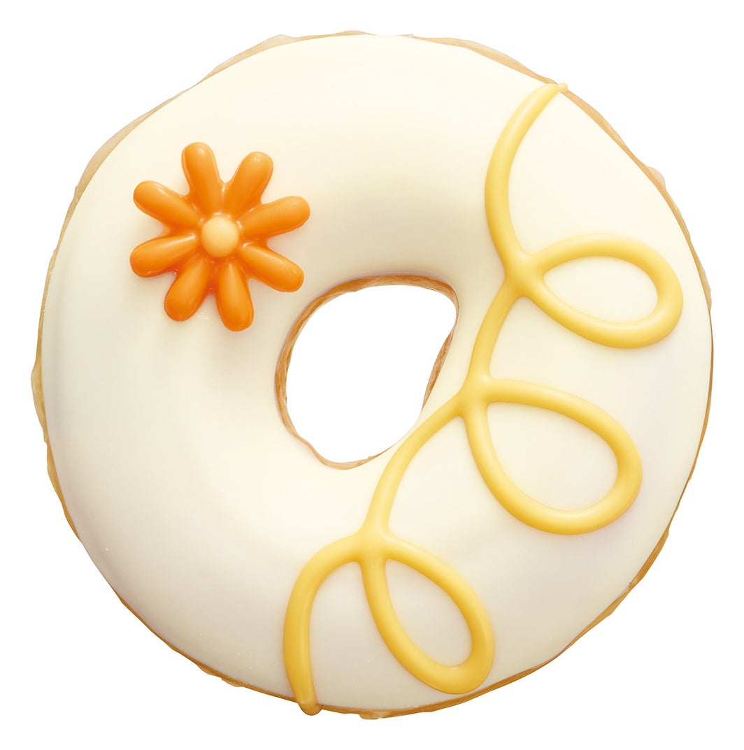『リトルフラワー』は、昨年大人気だった商品をリニューアルした新商品です。ミルキーなホワイトチョコでドーナツをやさしく包み、カスタード風味のコーティングで春の爽やかな風をイメージしぐるぐると線を描きました。仕上げにオレンジ色のお花のホワイトチョコをのせて、彩りを添えました。