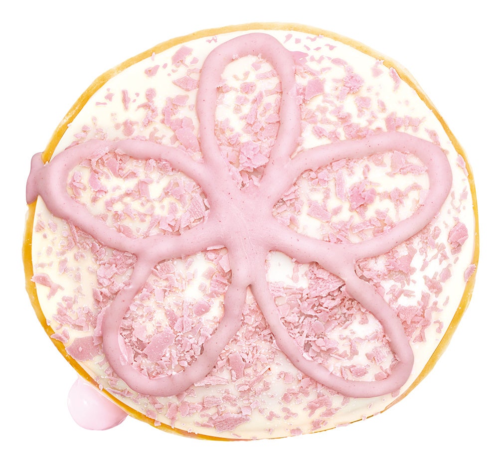 『さくら』は、その名の通り桜の花をイメージしたドーナツで、桜の花が咲き乱れる可憐な様子を表現しました。さくら餅のような味わいの、桜風味のクリームがつまった生地の上に、ミルキーなホワイトチョコをコーティング。ふわっと桜が香るシェイブチョコを桜吹雪のように散らせ、その上に甘酸っぱいストロベリー風味のラインで桜の花を描いた、春満開なフラワードーナツです。