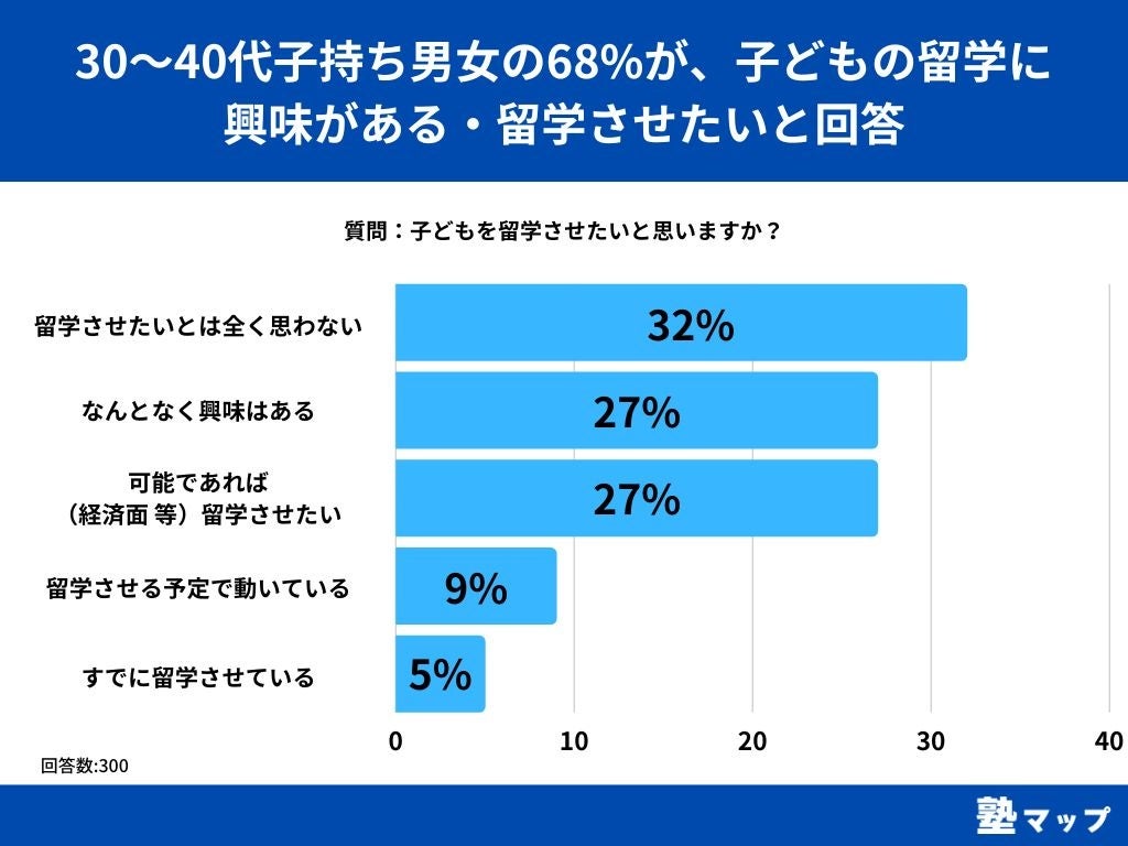 30~40代の男女を対象とした「子どもを留学させたいと思いますか?」というアンケートで最も多かった回答は「留学させたいとは全く思わない」で32%でした。