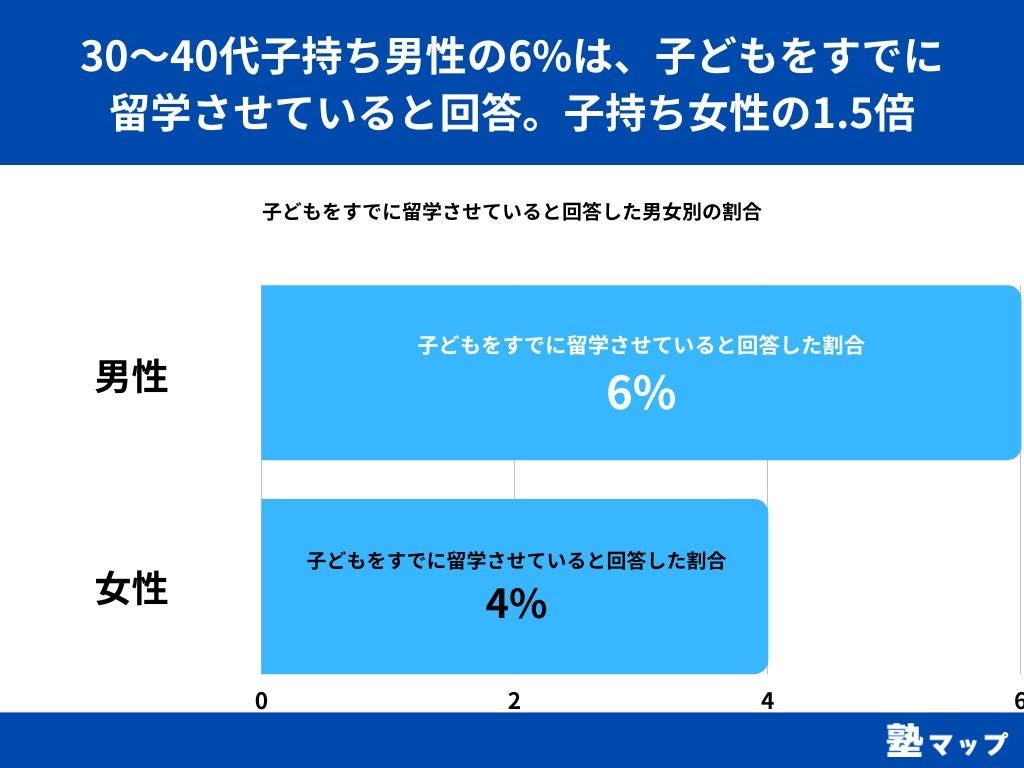 【30~40代子持ち男性の6%は、子どもをすでに留学させていると回答。子持ち女性の1.5倍】