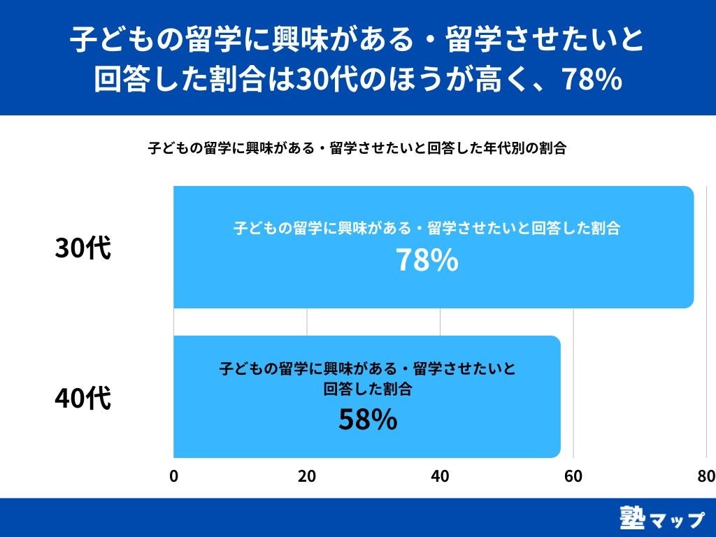 子どもの留学に興味がある・留学させたいと回答した割合を年代別でみてみますと、30代が78%、40代が58%という結果になりました。