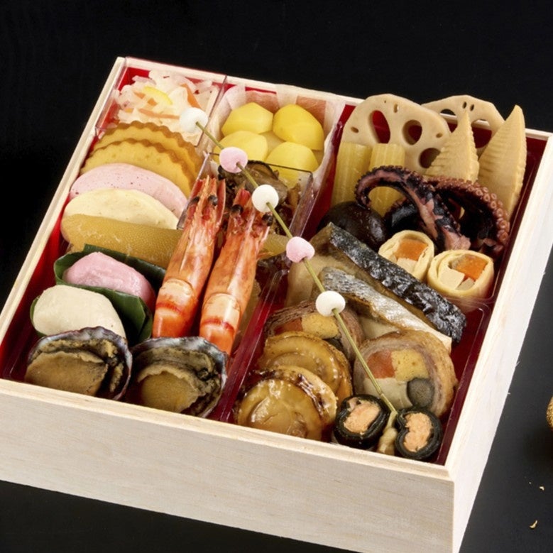 ◇数の子 ◇紅白笹麩まんじゅう ◇煮海老 ◇煮鮑 ◇蓮根 ◇蕗 ◇筍 ◇椎茸 ◇煮蛸