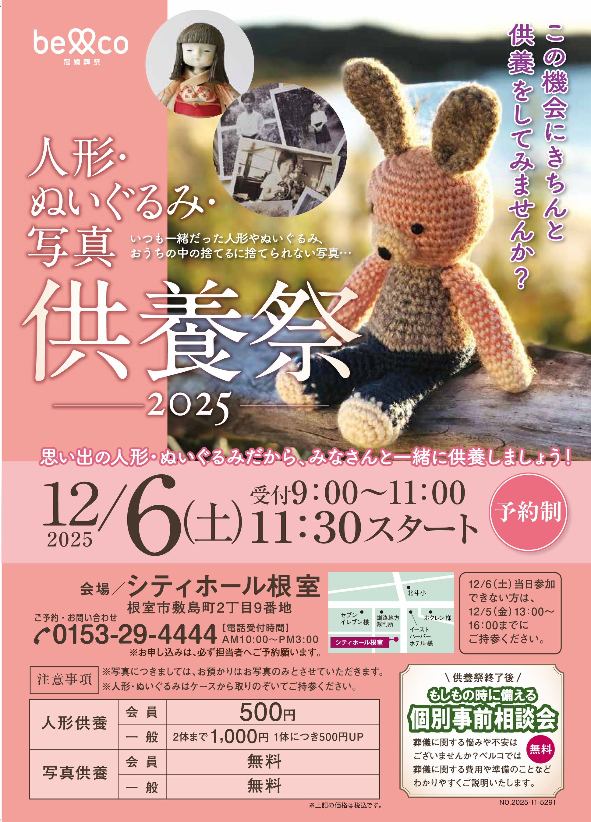 2025年12月6日(土)、株式会社ベルコ(シティホール根室)は、長年大切にしてきた人形・ぬいぐるみ・写真に感謝を込めて送り出す「人形・ぬいぐるみ・写真 供養祭2025」を開催いたします。本供養祭は予約制となっており、受付は当日9:00〜11:00、供養式は11:30より執り行います。