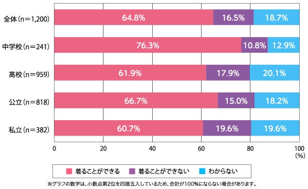 性別を問わない制服着用については、自分が着たいタイプの制服を「着ることができる」(全体64.8%、中学校76.3%、高校61.9%、公立66.7%、私立60.7%)という回答が6割を超えました。LGBTQ生徒への配慮から、性別にとらわれない制服の選択肢(スカート・スラックスの選択など)を許可している学校が増えているようです。