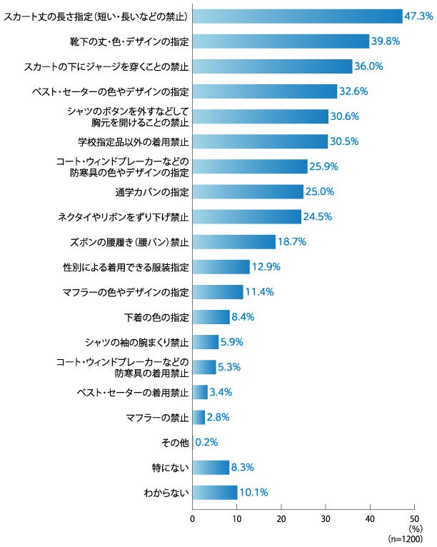 学校の服装規定で定められているものは、「スカート丈の長さ指定(短い・長いなどの禁止)」(47.3%)、「靴下の丈・色・デザインの指定」(39.8%)、「スカートの下にジャージを穿くことの禁止」(36.0%)、「ベスト・セーターの色やデザインの指定」(32.6%)、「シャツのボタンを外すなどして胸元を開けることの禁止」(30.6%)、「学校指定品以外の着用禁止」(30.5%)など、学校で流行っている制服のアレンジを禁止する内容が多くあげられました。