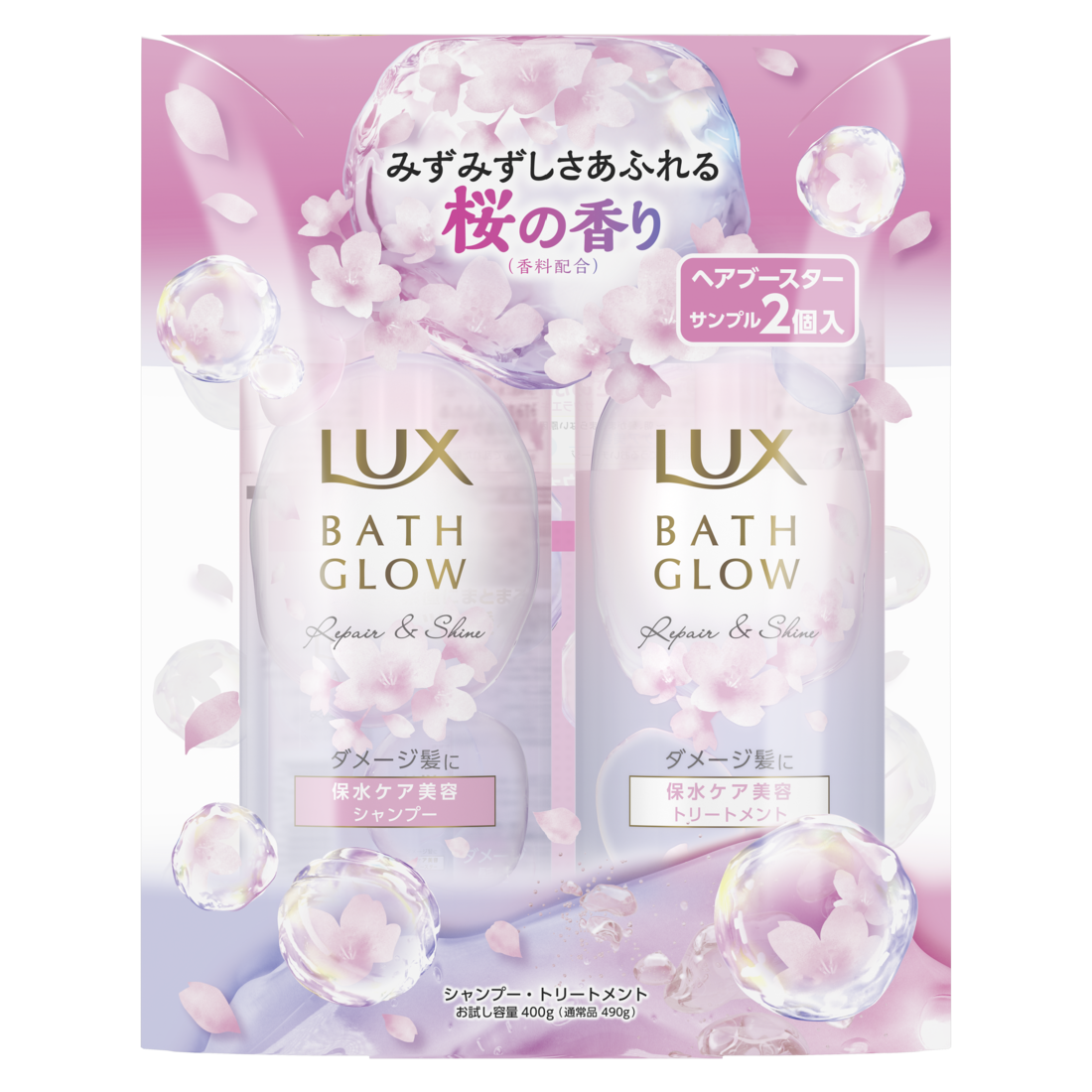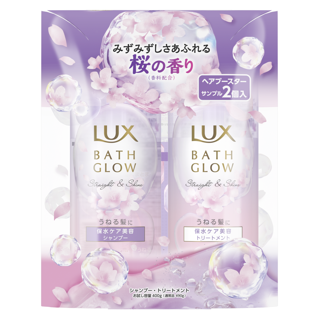 ラックス バスグロウは、お風呂上がりの髪のまとまりやツヤが一日続いてほしい、という多くの声から誕生した、“保水ケア美容”をコンセプトとした製品です。髪一本一本にうるおいをチャージし、保水力持続のため、ぷるぷる浸透ウォーターゼリー※7配合処方により、朝起きてから1日中素直にまとまるツヤ髪へ導きます。サクラ シリーズではサクラエキス(保湿成分)配合で、よりみずみずしさにあふれる香りを表現しています。ヘアブースターのサシェ付きで、お試しいただけます。