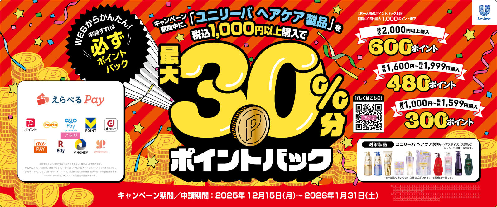 ユニリーバのヘアケア対象商品を1,000円以上ご購入により全員にえらべるPayが当たる店頭キャンペーンも開催します。詳細はキャンペーンサイトをご覧ください。たくさんのご応募をお待ちしております。