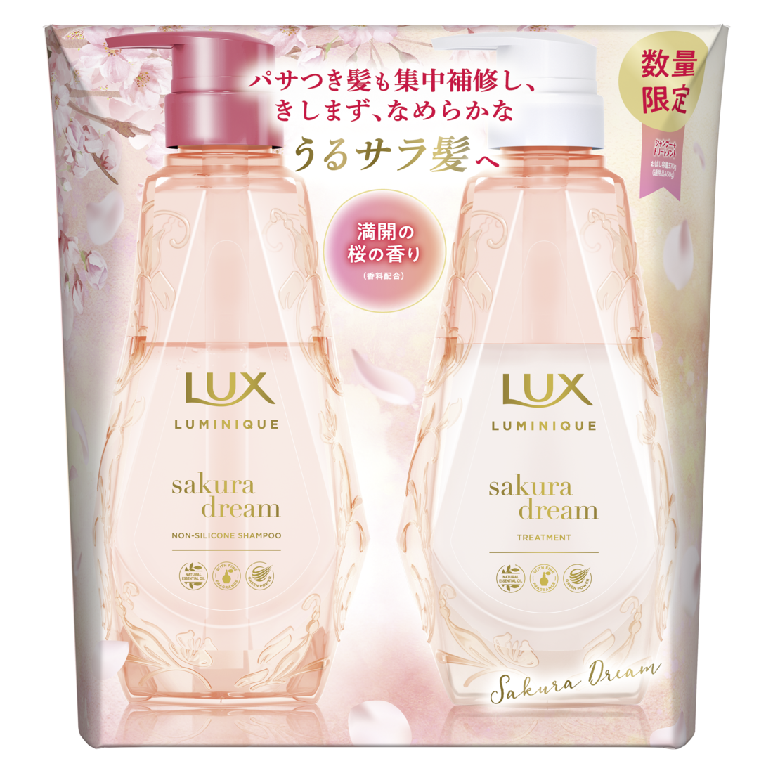 ラックス ルミニークは、毎日忙しい生活の中でバスタイムを贅沢な時間にしたいと考えている女性に向けた、きしまないノンシリコンシャンプーシリーズ※6です。サクラドリームシリーズではその名にふさわしい満開の桜を彷彿とさせる華やかな香りで、乾燥や花粉による春のパサつきを抑えつつ、潤いのあるさらさらとした髪へと導きます。