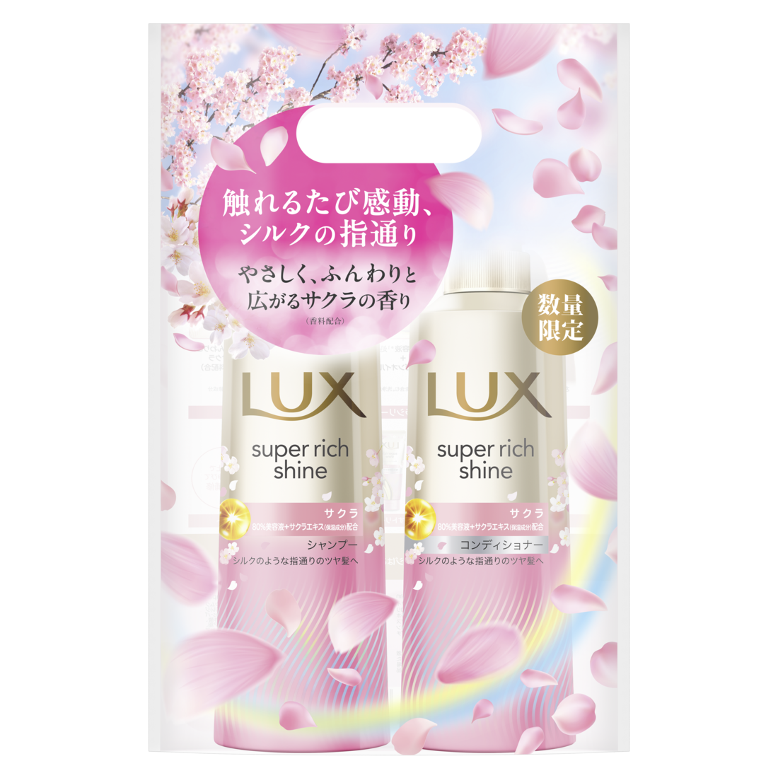 ラックス スーパーリッチシャインは、ダメージ・パサつき・うねり・ツヤのなさといった、髪の悩みのそれぞれに丁寧にアプローチすることができる、ラックスの中でも基幹となる商品です。2025年9月に、処方、パッケージともに10年ぶりとなる大型リニューアルでアップデート。シャンプー、コンディショナーは80%美容液※1処方、シルク・アルガンオイル※2を配合し、シルクのようなツヤ髪を表現しています。トリートメントの使用で、さらにツヤのある滑らかな髪へと導きます。冬の厳しい乾燥ダメージを保湿ケアし、春に向けたやさしいサクラの香りで、晴れやかな気持ちで春への準備をしてみてはいかがでしょうか。
